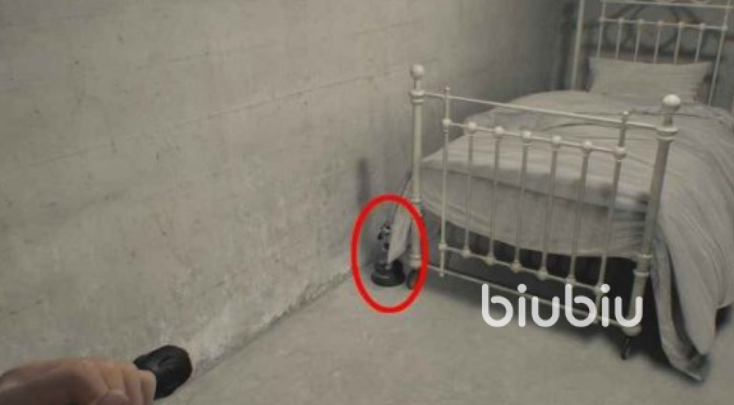 5、需要穿过警卫室,然后前往关着小女孩的牢房,在前方左边的房间里面,放着一个白色的钢架单人床,在左侧床脚处放着一个浣熊。