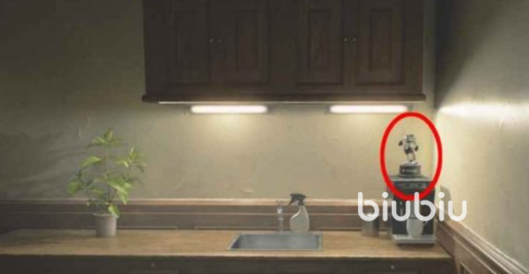 4、找到一楼厨房区域,进入之后能看到水槽,右侧咖啡机上面摆放着一个。