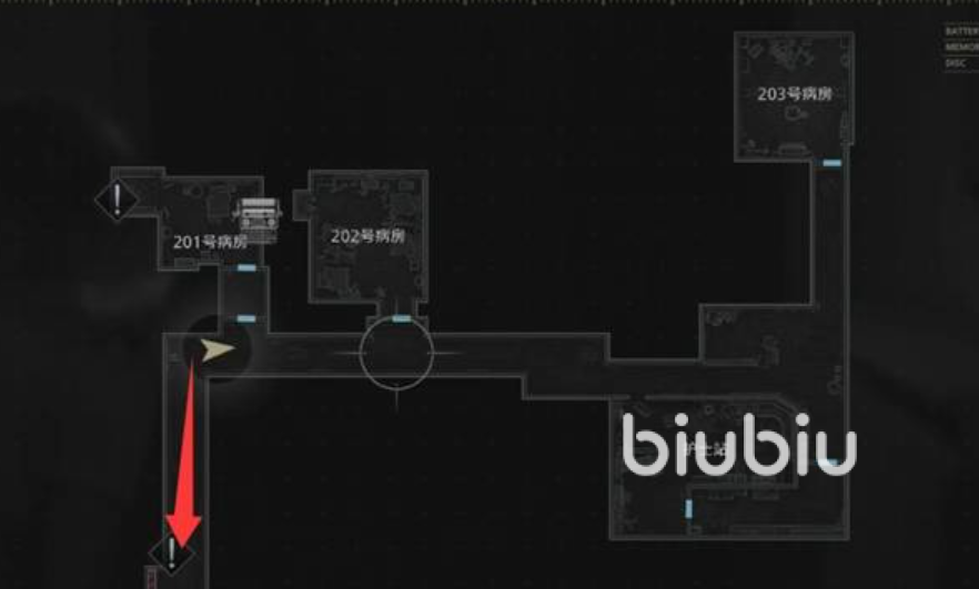 进入201号病房,用智天使钥匙打开201号病房,房内有一台打字机(存档用)和一些空瓶子。在隔间旁的架子上可以找到一只打火机,打火机是探索黑暗区域的重要光源,一定要随身携带。