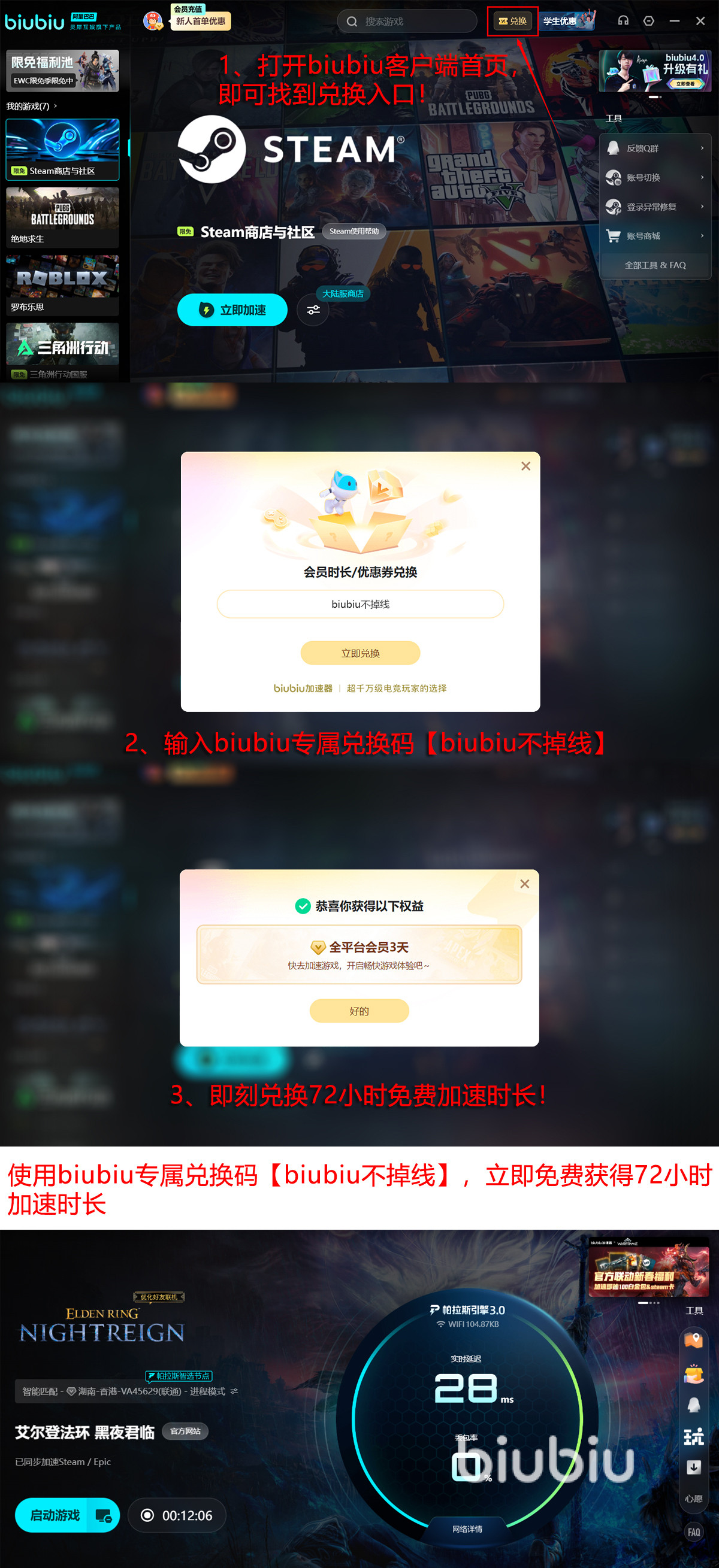 启用后延迟降低的很多,而且丢包率也基本控制在0了,趁着有免费福利一定要物尽其用。来注册下,新用户轻松享受24h加速时间的,再来兑换下口令码,拿上【biubiu不掉线】后就立马又送来免费的服务时间长达72h,全累计不就等同于给新用户用96h加速时间。