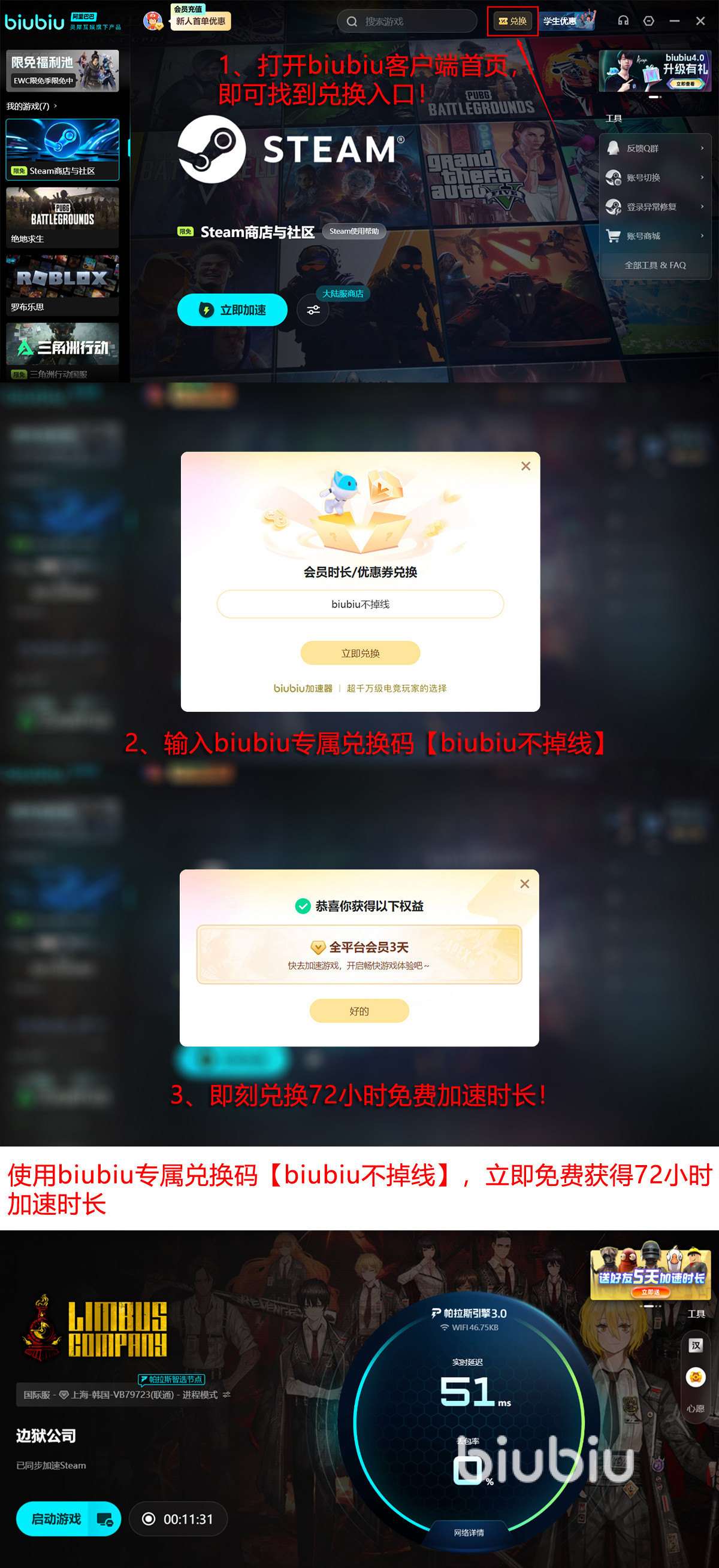 优惠可都准备好了,这些也不能错过,新人一定要注册,会轻松拿到24h加速时间用的,接着【biubiu不掉线】可一定要拿去换,会多得到72h服务时间的,那就是新人总共领到96h服务时间的,可好好利用。