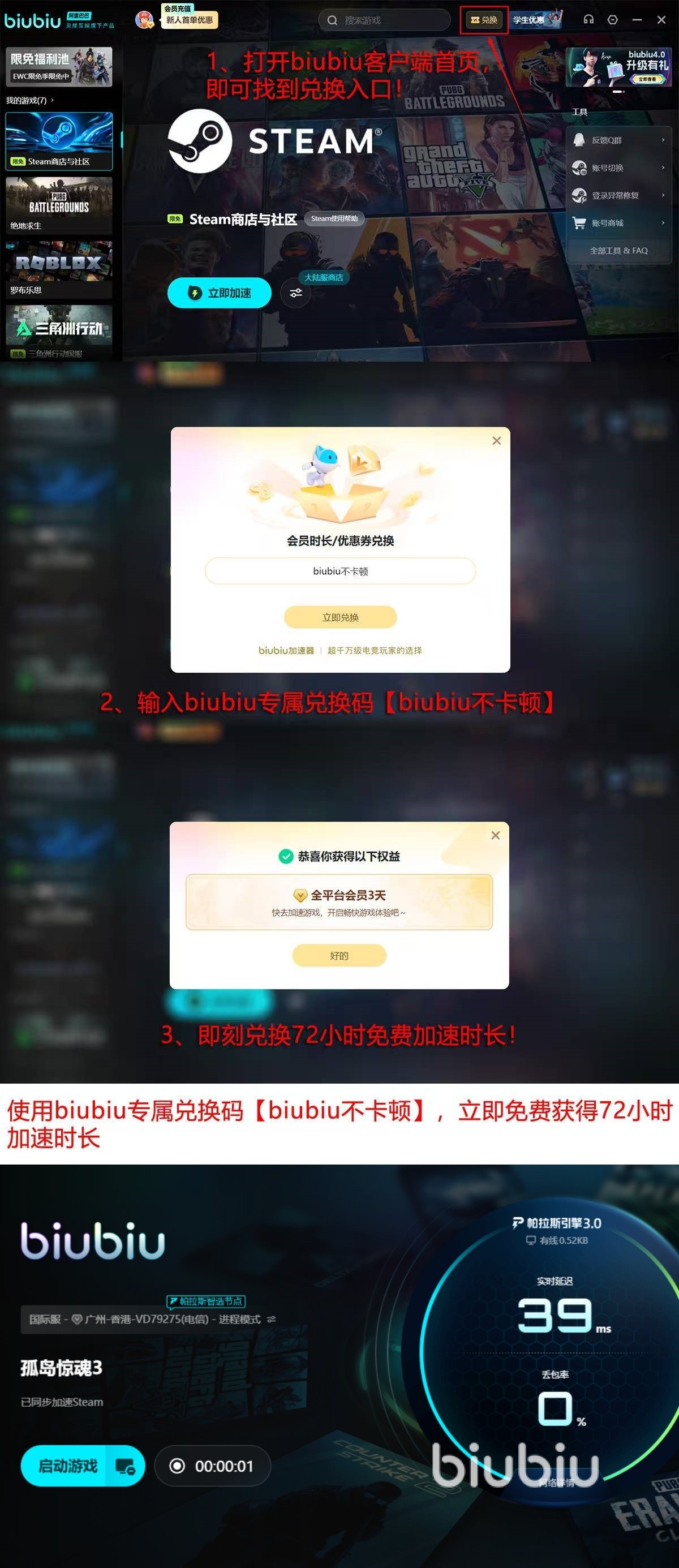 现在这款加速器对于新用户来说也是比较友好的。现在新用户在第一次进入软件的时候可以获取到24小时的免费加速时间。使用兑换码【biubiu不卡顿】则可以获取到额外3天的免费加速时间。总共可以让我们获取到96小时的免费加速时间。