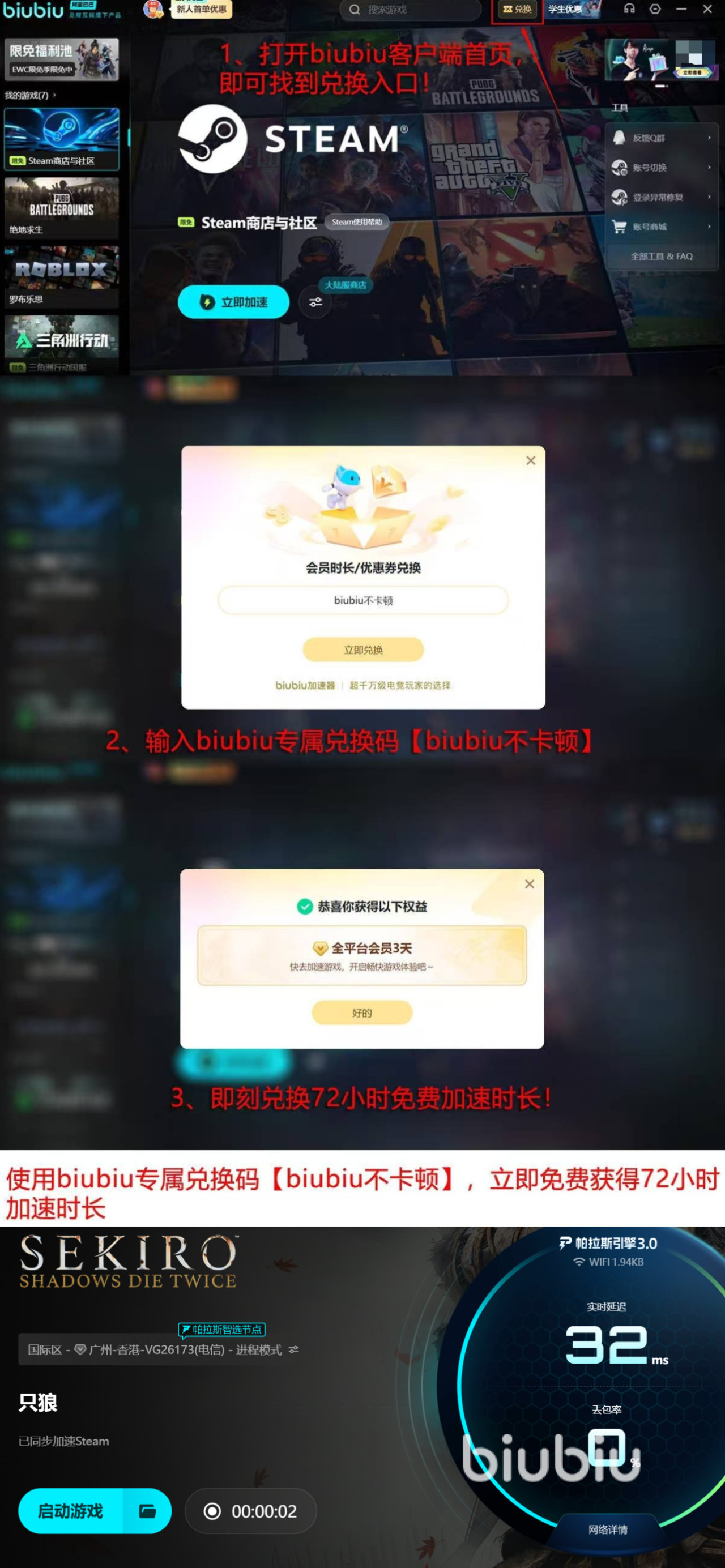 推荐这个应用的原因是对新用户来说非常友好,比如新人登录的时候,平台是会直接赠送一整天的体验时间的,不需要大家花钱,可以直接享受,同时平台还给全部人提供了三天的体验机会,需要大家用准确的口令【biubiu不卡顿】在规定的兑换区域内输入领取。这些福利都可以让大家可以免费去感受平台提速下的游戏环境,新人更是可以将两者叠加一起沉浸式的畅玩四天,若是不能连贯体验,剩下的三天大家想什么时候兑换都可以,非常灵活。