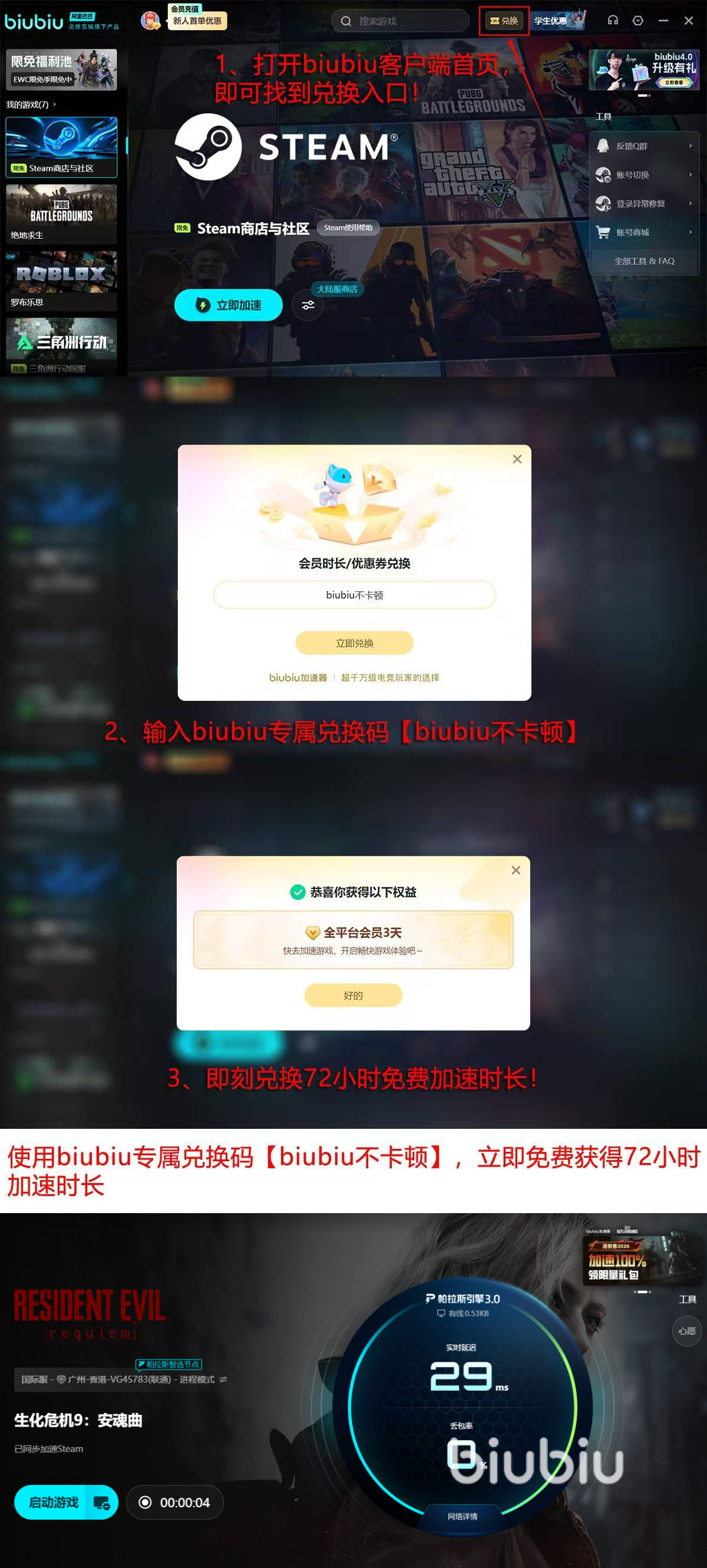 新用户注册即可激活首日24小时全功能试用,输入【biubiu不卡顿】额外领取72小时加速时长,总计畅享96小时无卡顿的生化生存之旅,装备技巧与强力工具,直面浣熊市的终极噩梦吧。