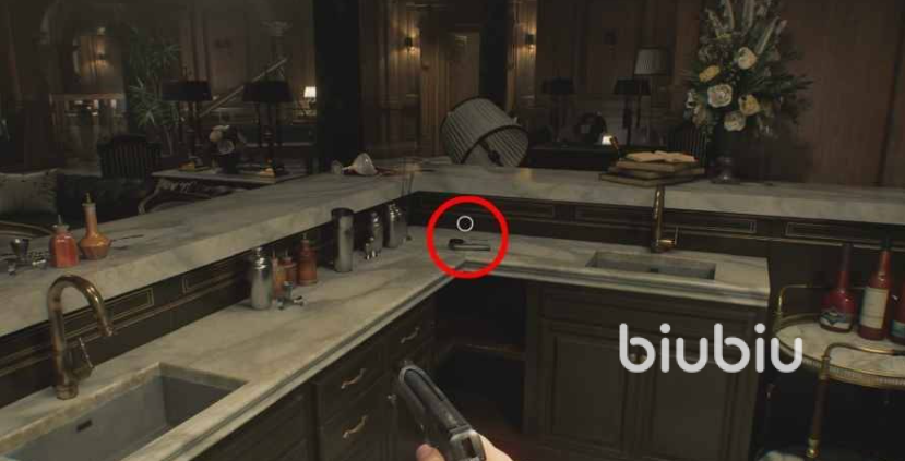 就在休息室的吧台上面,威力一般,有其他武器可以不用它。