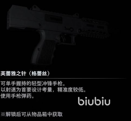 4000cp解锁的奖励武器,格蕾丝使用,以射速为主的轻型冲锋手枪,精准度较低。