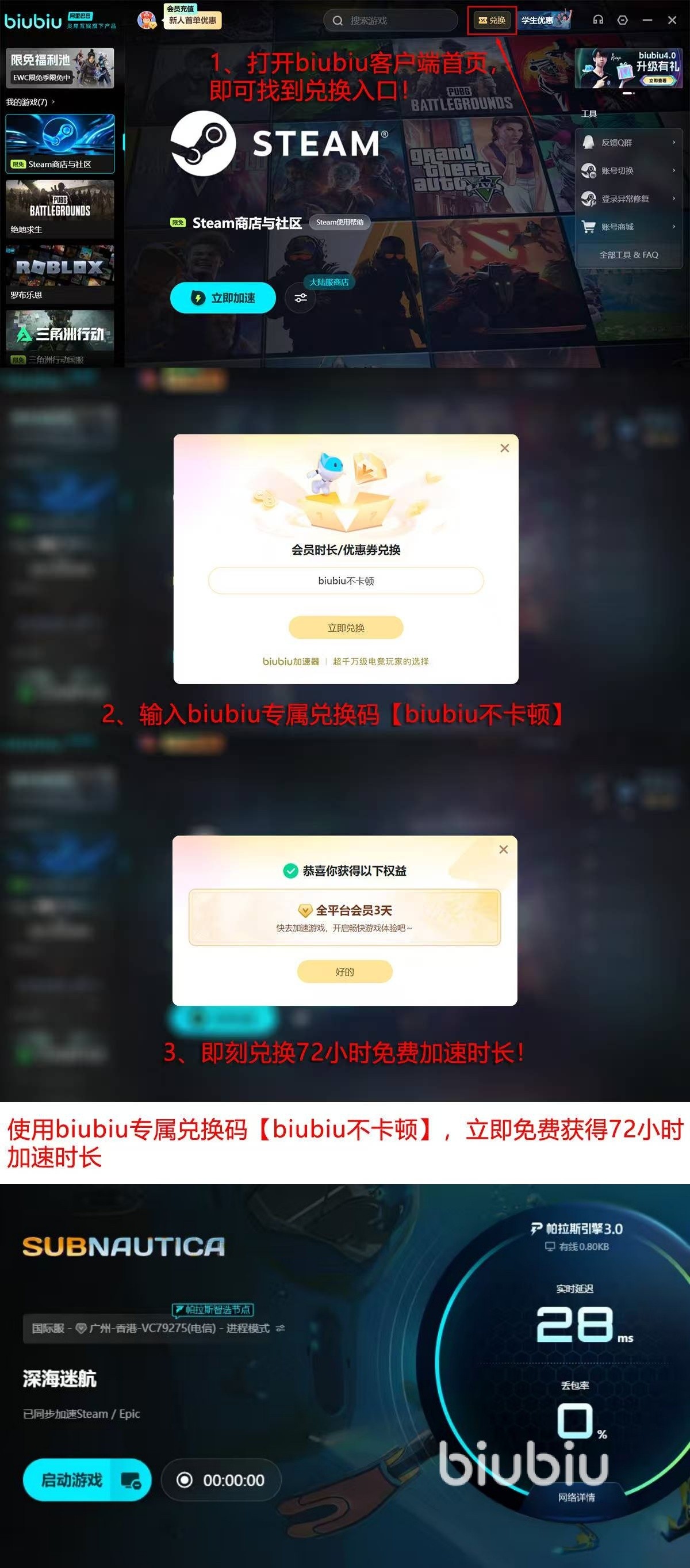 很多没体验过的朋友,可能会担心实际的效果,但现在biubiu特意准备了两大福利,首先新人只要注册登录,系统就会直接发放24小时免费的加速时间,其次在首页找到兑换界面,在这里输入【biubiu不卡顿】这个口令,会发放72个小时,两项福利还可以叠加,合在一起就有整整96小时。