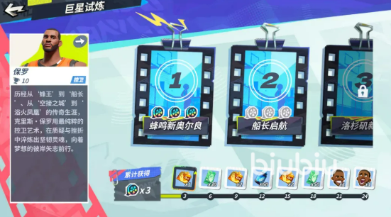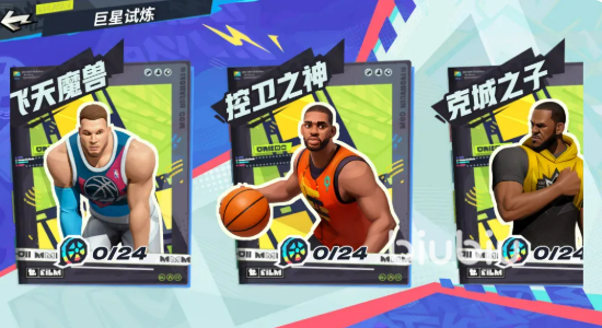 另一玩法“巨星试练”归属休闲模块,需在获取对应巨星球员后方可解锁专属剧情副本。副本命名呼应球员身份标签,如“飞天魔兽”“空位之神”“克城之子”,每个章节均复刻该球星标志性动作、经典比赛场景及关键成长节点。通关非自由式闯关,须达成关卡预设目标(如命中率、得分方式、时间限制等)方可获得星级评定。