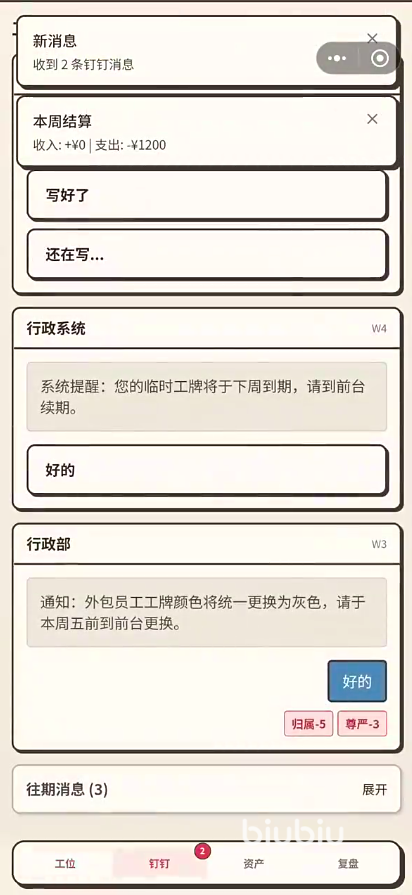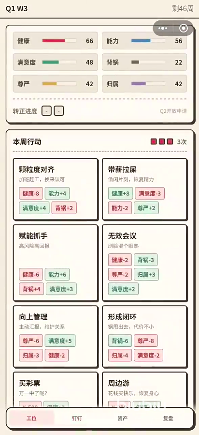 独创的“周目考核”机制是游戏核心驱动力之一。每七日进入一次职场综合评估,涵盖KPI达成率、文档规范度、跨部门协作评分等维度。考核结果直接影响薪资涨幅、转正机会及隐藏剧情分支。需注意:长期单一行为(如连续摸鱼)虽提升自由属性,但会导致绩效滑坡,工资数值将显著降低,难以支撑中期生存需求。