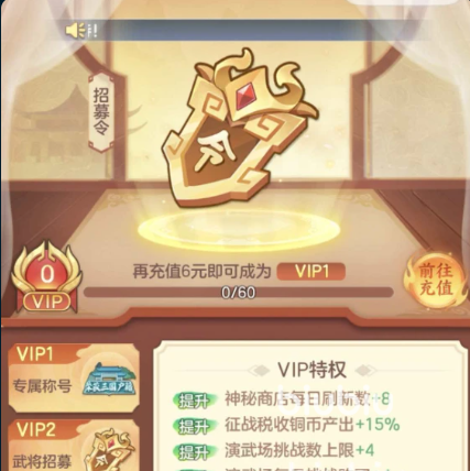 完成6元首充不仅获取元宝,还可激活专属招募卡池,用于定向获取赵云等高人气武将。同时,该笔充值将直接解锁VIP1等级,并授予“夜三国户籍”称号。随着VIP等级提升,后续可开放更高阶武将招募权限及限定头像框。VIP用户还享有神秘商店每日刷新次数+8的特权,大幅提高稀有道具获取概率。