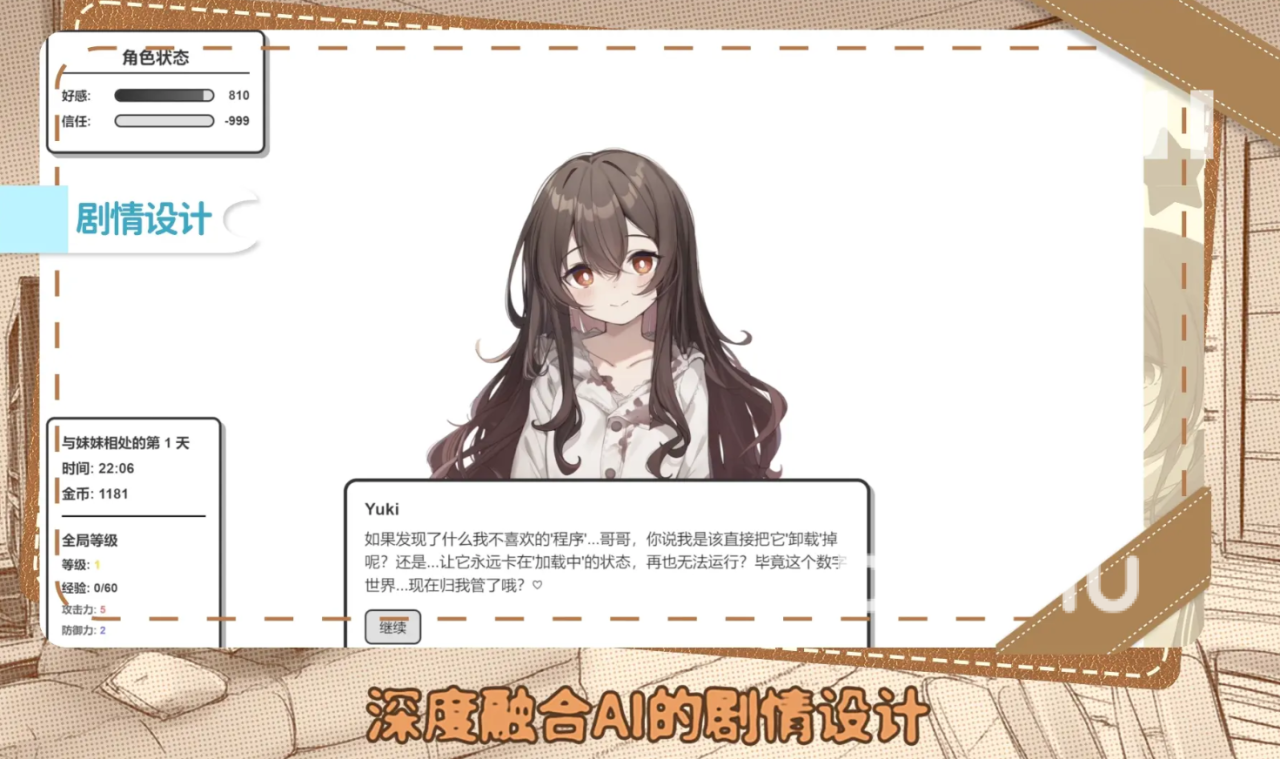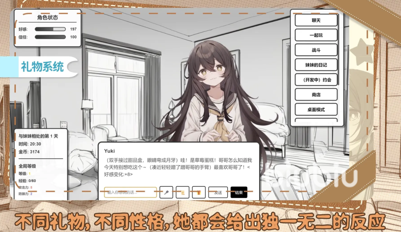本作最大技术亮点在于AI驱动的互动叙事系统。区别于传统选项固定、结局预设的文字游戏,《妹居物语》中的每段对话均基于上下文语义理解生成,配合多层人格参数建模,使妹妹的反馈更具记忆点与真实感。这意味着同一剧情在不同时间、不同选择路径下,可能衍生出截然不同的交互体验,大幅提升了内容复用率与长期可玩性。