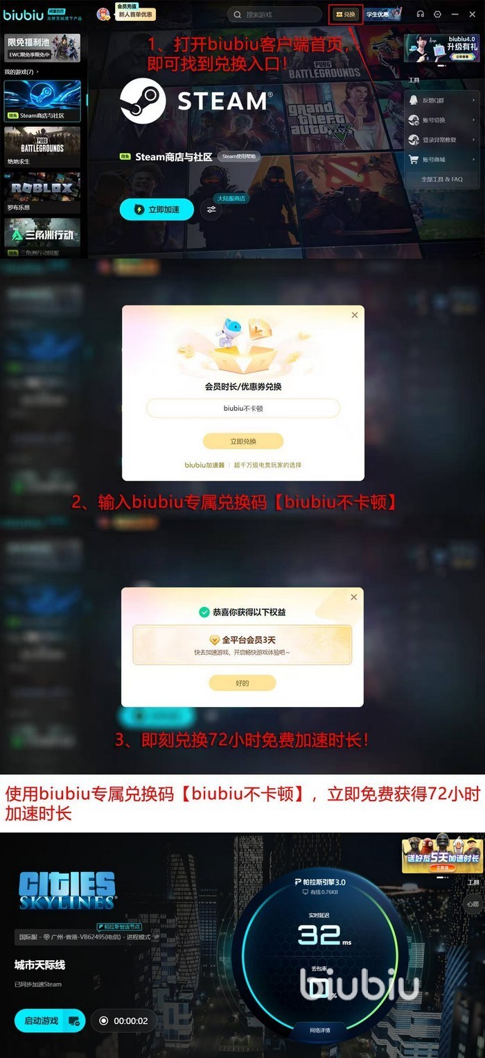 针对新用户,平台提供注册即享24小时全功能加速权益;叠加口令“biubiu不卡顿”,可额外兑换3天全平台高级会员资格;两项福利可合并使用,合计获得96小时无限制加速服务。老用户亦可凭同一口令激活对应时长,确保稳定接入体验贯穿整个游戏生命周期。