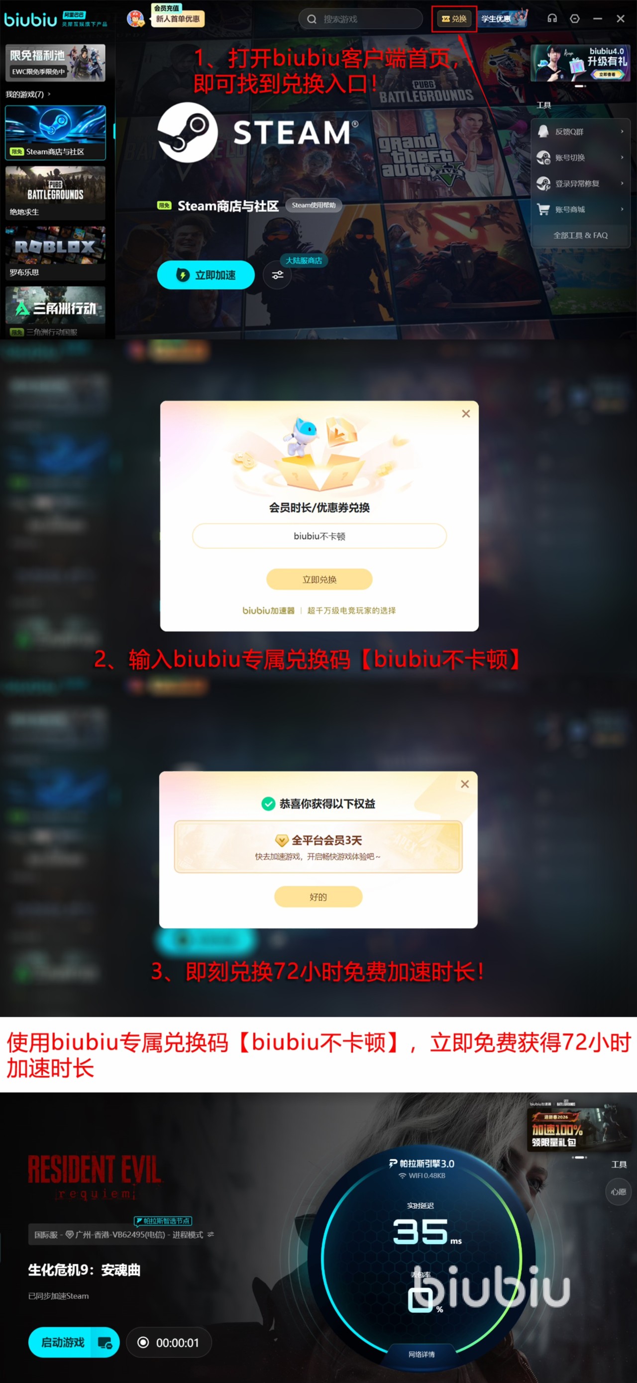 启动加速服务前,请优先领取平台专属福利:新用户可直接获赠24小时免费加速时长;所有用户均可凭口令【biubiu不卡顿】兑换3天高级加速权限。