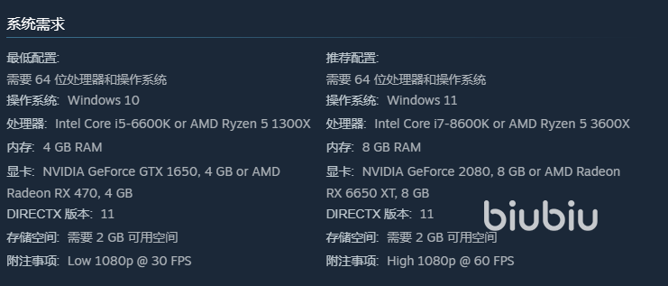 目前配置信息给的还是比较全面的,最低我们也要有i5-6600k的处理器,搭配gtx1650的显卡,并且注意运行内存达到4gb,留够2gb的存储空间。做到这样只能开启中低画质,很多人是想要更好的视觉效果的,那就将处理器提升到i7-8600k的级别,然后搭配2080以上的显卡就行。