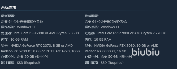 现在Steam上可以找到相关商店页面了,进入之后可以清晰看到配置需求,最低配置是运行中低画质的标准,需是i5-9600k的cpu,运行内存要有16gb,然后显卡最好是rtx2070以上,留够50gb的存储空间就差不多了。要是开好点的画面,cpu到i7-12700k以上,显卡升级到rtx3080的版本就好了。