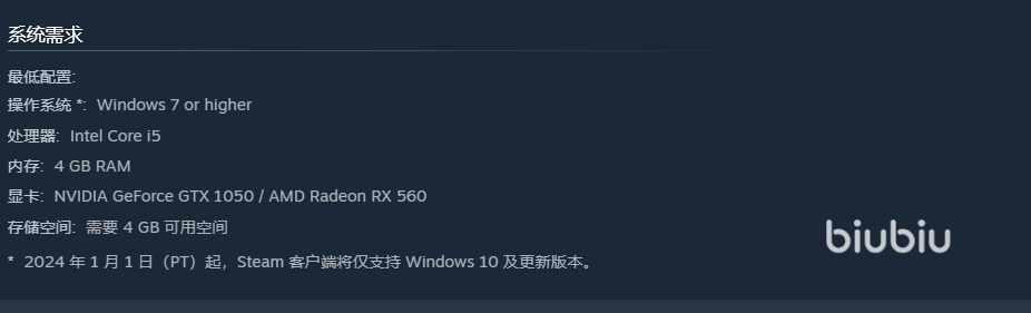 在商店页面之上,所需的配置都已经标注出来了,最低的系统要求为Windows7,处理器是英特尔i5以上就能顺利运行整个游戏,处理内存最好是在4gb以上,存储空间也是只需要这么大,然后显卡要求很低,只需要gtx1050就行了。如果配置比这个好,就可以开启更好的画质。