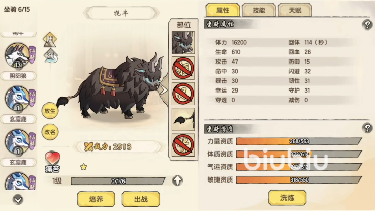 牦牛是高原地图专属肉盾型灵宠,拥有全灵宠中顶尖的基础生命值与物理减伤系数。除战场抗压能力外,其掉落物(如牦牛角、厚皮)为后期融合系统核心消耗材料。驯养方向有两种:一是作为高耐久前排,利用冲撞技能提供突进+小范围击退;二是专注资源收割,通过反复刷取获取融合素材。值得注意的是,牦牛参与融合后有概率产出神兽级灵宠麒麟,属当前版本唯一已知麒麟获取路径。