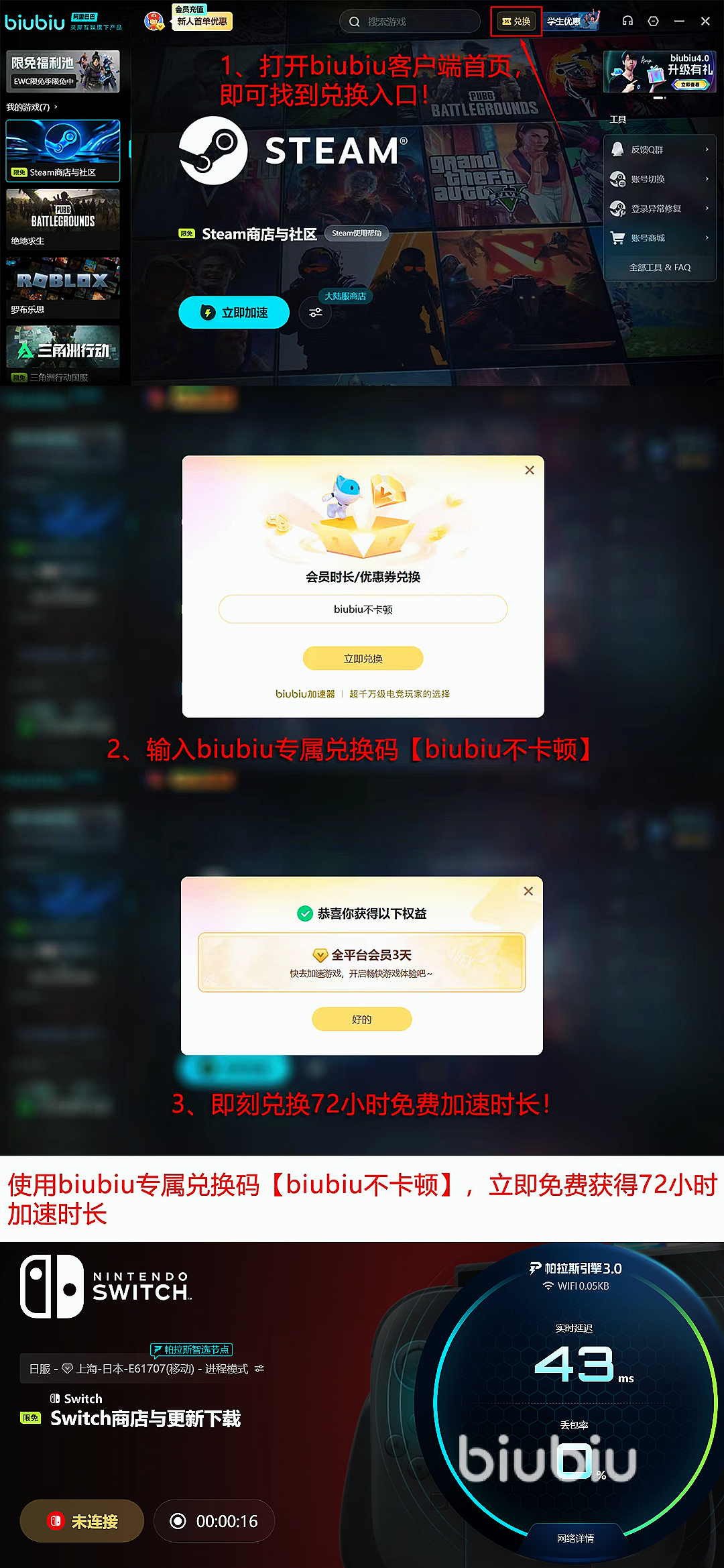 为降低体验门槛,新用户注册biubiu加速器后,可立即启用24小时全游戏免费加速服务;所有账号在结算页输入专属口令【biubiu不卡顿】,即可额外获赠3天无限制加速时长。