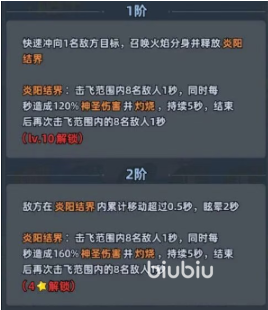 二技能为阶梯式进阶控场技:初始阶段突进并召唤火焰分身,对路径及落点范围内最多8名敌人造成击飞,并在5秒内持续造成总计120%神圣伤害,附带灼烧效果;升至第二阶段后,每秒伤害提升至160%,且敌方单位在结界内移动累计超0.5秒即触发1秒眩晕;第三阶段进一步强化,眩晕时长延长至3秒,结界持续时间同步增加。该技能在群怪环境中的覆盖率、控制链与团队增益能力极为显著。