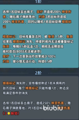 一技能为单体强杀与群体干扰复合技:释放后掷出灵扇,对首个目标造成200%神圣伤害;扇子落地瞬间,触发范围灼烧,对周围至多3名敌人额外造成200%神圣伤害,并随机赋予一名敌方单位【扇标记】。该标记具备三重战术效果——当被标记目标即将发动普攻时,强制魅惑1.5秒;同时施加禁疗效果,使目标期间所有治疗量归零;灼烧本身还附带0.5秒定身效果。需注意:该技能对Boss类首领单位不生效。