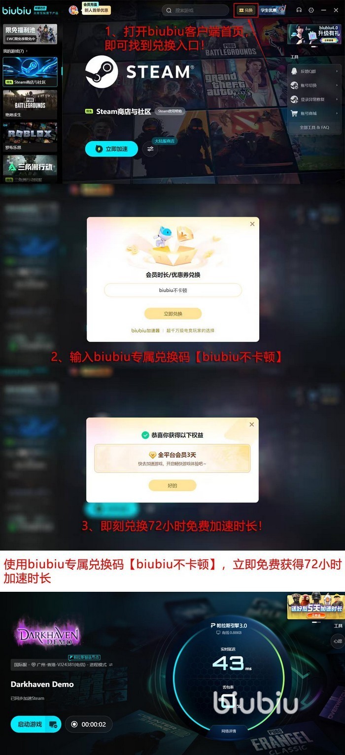 当前biubiu加速器已完成架构级升级,全新3.0版本搭载自研帕拉斯引擎,在节点调度、协议识别与抗抖动能力上实现显著提升。本次迭代特别邀请PUBG职业赛事冠军左梓轩担任技术体验官,全程参与多区域网络压力测试与延迟调优。福利政策同步更新:所有用户输入口令“biubiu不卡顿”,即可兑换3天全平台高级会员权限;新注册用户在领取该口令权益的同时,还将自动获赠24小时体验时长,两项叠加后,首次使用的玩家可连续享受96小时无限制加速服务。