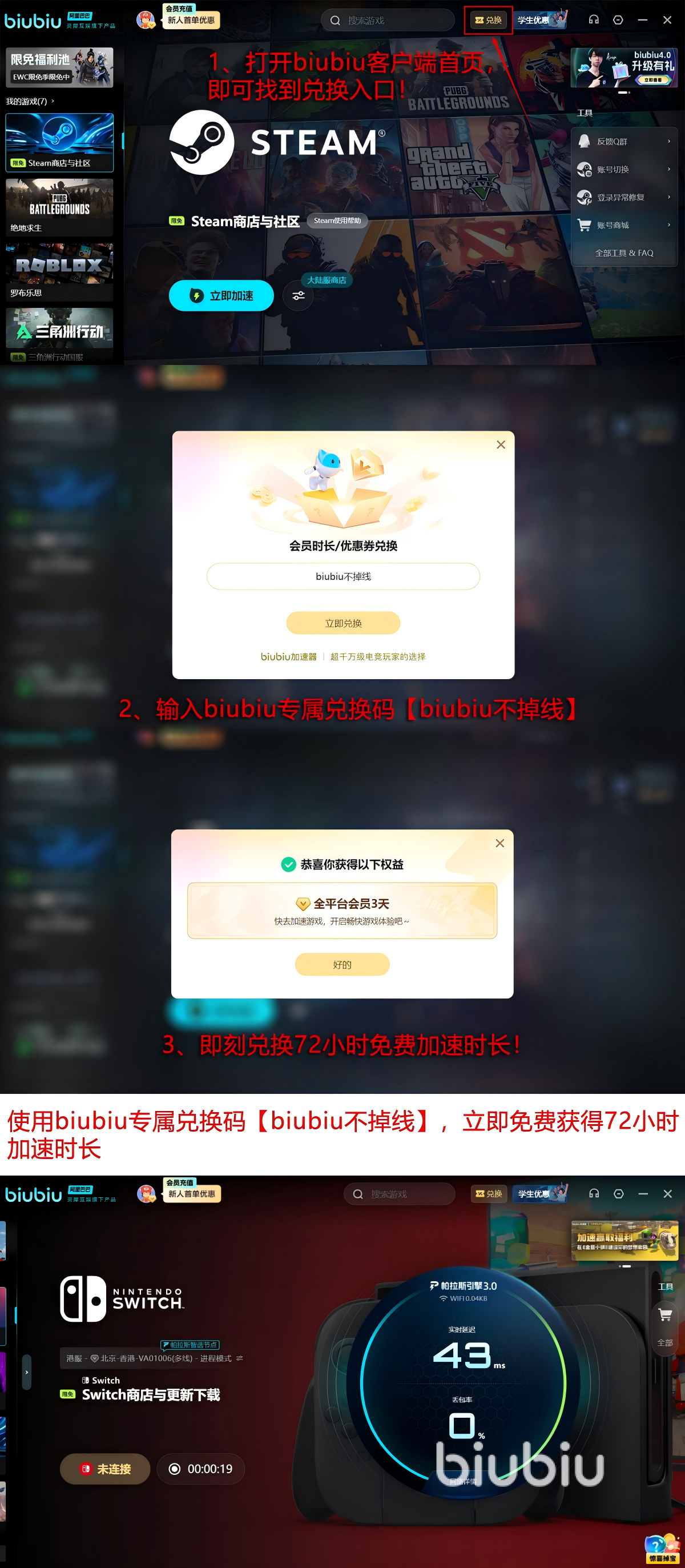 优惠这方面官方提供的也挺多的,来看看新人到底能拿到什么。注册之时,就可以登录领取24h免费加速的大礼包,兑换礼包则是需要知道口令是【biubiu不掉线】才能领,这个会多送72h额外服务时间,叠加后就送给新人96小时服务时间用。