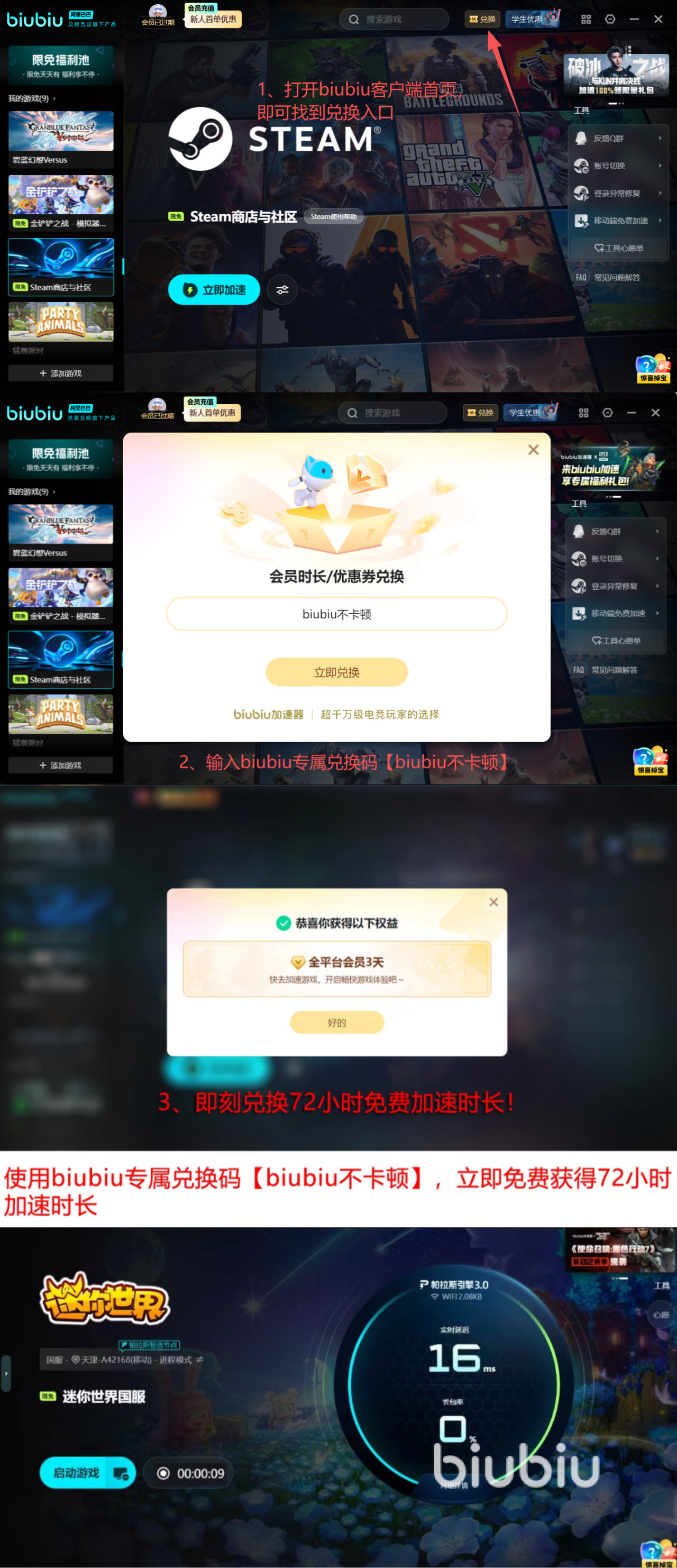 此刻正是体验巅峰网络的最佳时机!平台提供新人福利,即刻注册立得24小时无门槛专属加速服务;输入专属口令【biubiu不卡顿】,惊喜再享72小时优质加速时长叠加!总计96小时的免费尊享权益,助你彻底告别卡顿闪退烦恼,在迷你世界中尽情挥洒创意。
