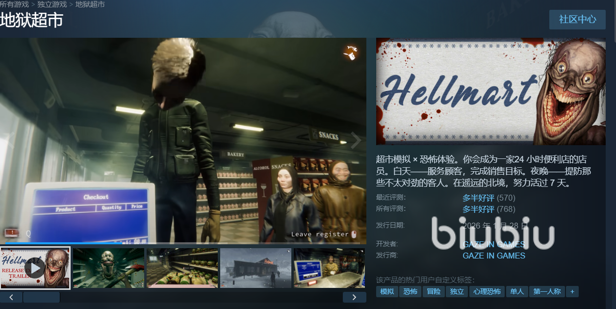 首先回答一下大家最关心的问题,地狱超市的上线时间是2026年的1月28日,这款由知名工作室GAZE IN GAMES开发的作品已经正式在steam平台中登录了,虽然是外国工作室的作品,但它对国内玩家非常友好,全程支持简体中文,这样在有游玩过程中阅读文本时就不会出现什么障碍了。游戏一共为朋友们设定了三个解决,游玩的阶段也以天为单位分成了白昼、傍晚和午夜,同学们要在不同的阶段中完成打理超市、赶走恶魔以及接待特殊客人等三种截然不同的任务,既能享受经营的悠闲,也能感受怪物突脸的刺激。