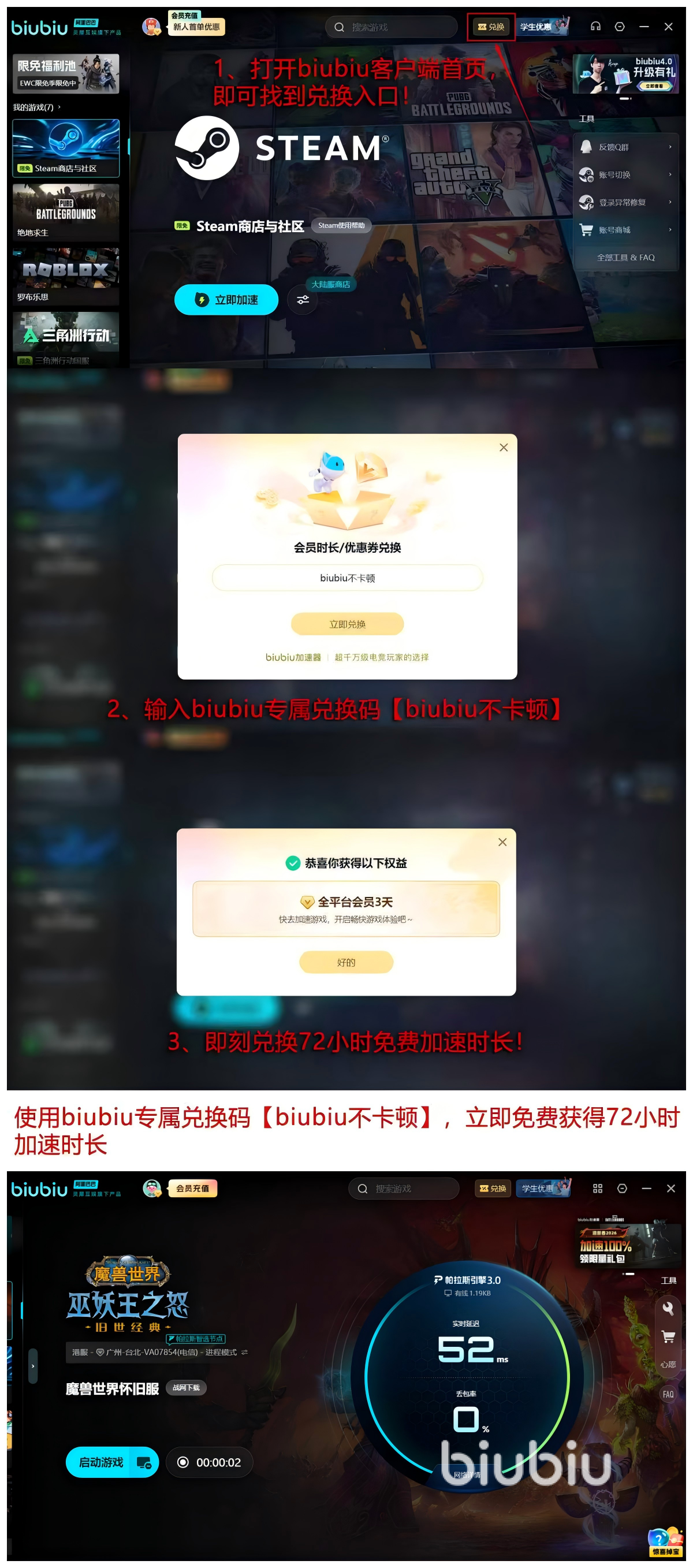 比如说福利兑换码【biubiu不卡顿】口令直接获取72小时加速,包括累计新人获取的加速福利24小时,总计能够获得96小时的加速时间,对于各位来说这些加速时间足够各位使用,能够让各位进行战斗或者匹配的时候更加流畅。