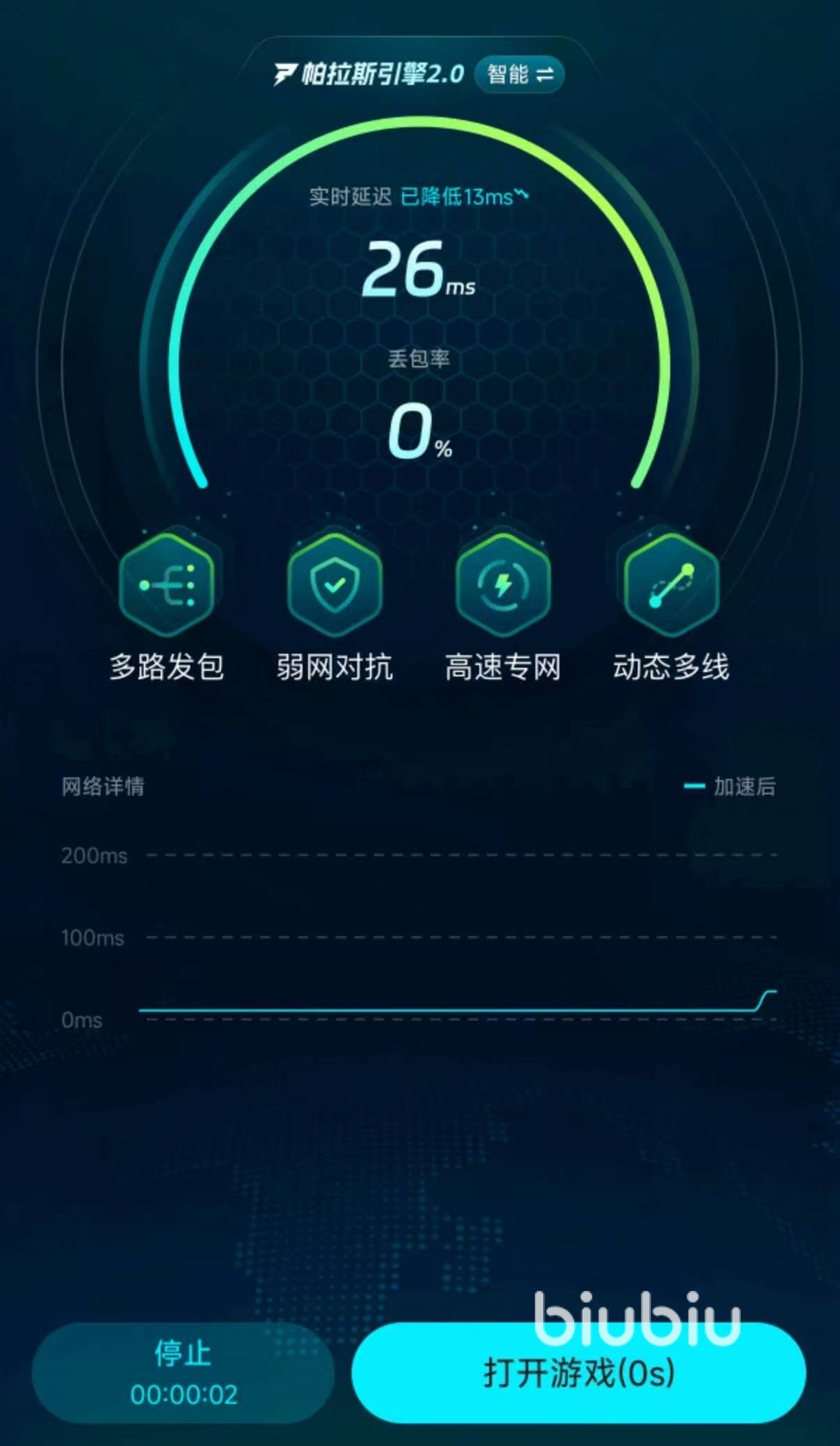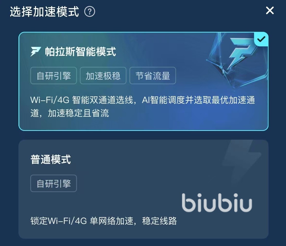 对于很多手游,biubiu还有专属优化措施,自身的全链路TCP和UDP双协议智能调度技术,适配各类手游选择。有效降低延迟、抖动、丢包等情况,大幅度提升操作和游戏中的跟手度。在安全方面更是完全值得信赖,拥有加密级传输技术,可以保证账号安全。在实际操作的时候,用户还可以自己手动进行加速模式的选择,目前一共开放了帕拉斯智能模式和普通模式这两类。只要自身的流量充足,那么帕拉斯智能模式都是最佳选择,利用自研引擎加速极其稳定,还有节流量的作用。