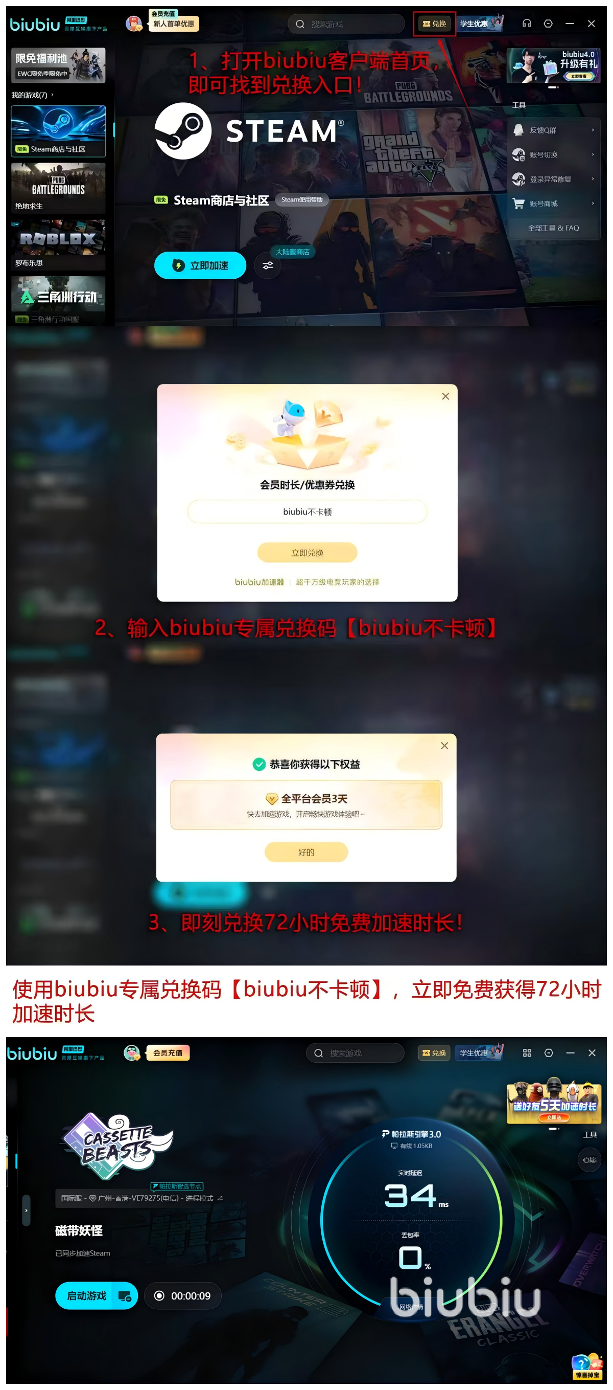 输入【biubiu不卡顿】口令能随时领取72小时轻松获取,同时可以累计新人获取的加速福利24小时,总计能够获得96小时的加速时间,时间充裕的同时还能享受付费用户的相同待遇,保证能让各位不用任何花费感受到加速的好处,成为持久的biubiu使用者。
