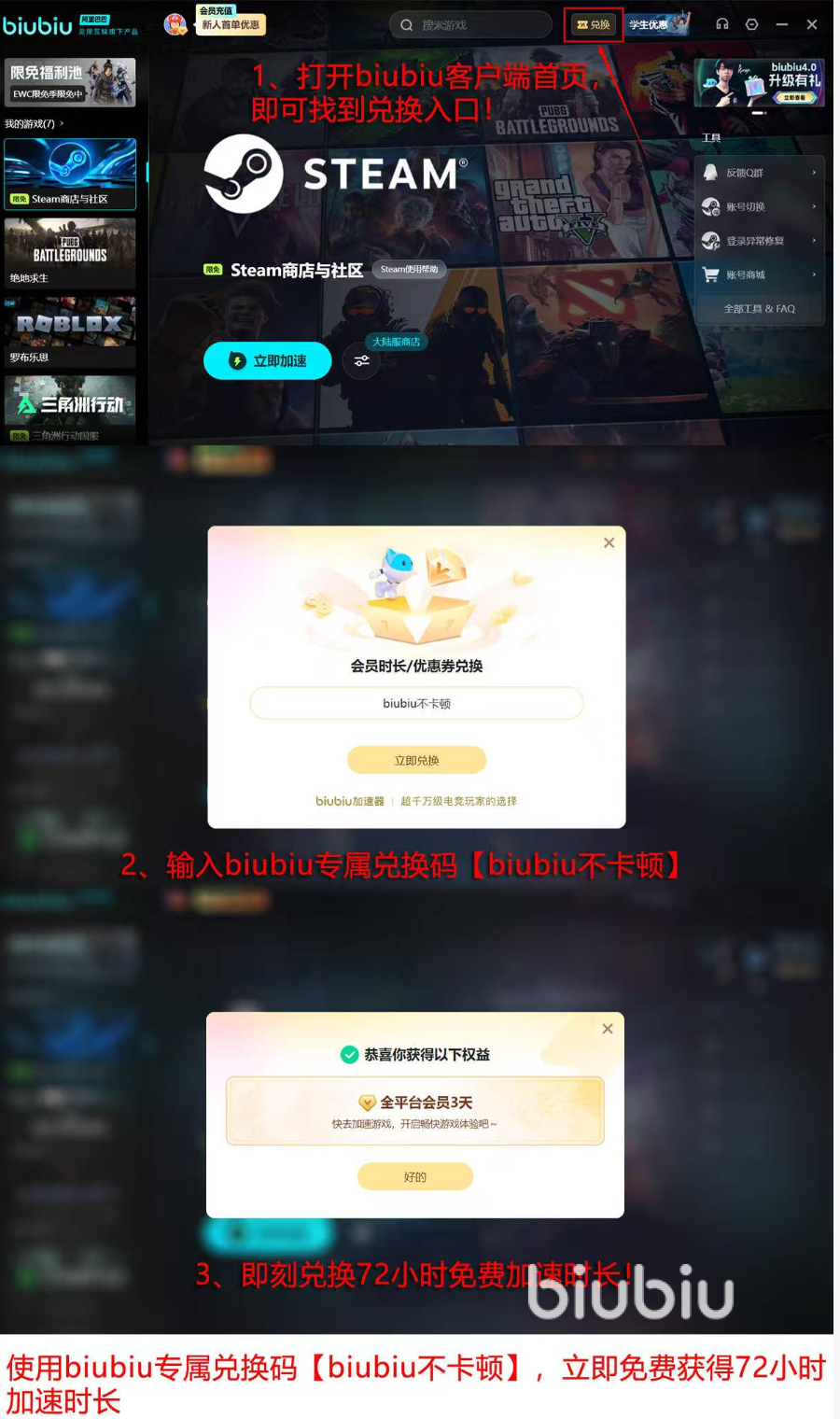 玩家不必再为网络导致的游戏崩溃而烦恼。特别是对于新用户,biubiu加速器还会提供很友好的福利。第一次注册的时候可以享受24小时的免费加速时间,用【biubiu不卡顿】兑换码还可以再获得三天的免费加速。既可以让玩家在游戏里享受到更好的网络体验,又给大家提供了一个不错的试用机会,让更多的玩家在体验之后做出选择。