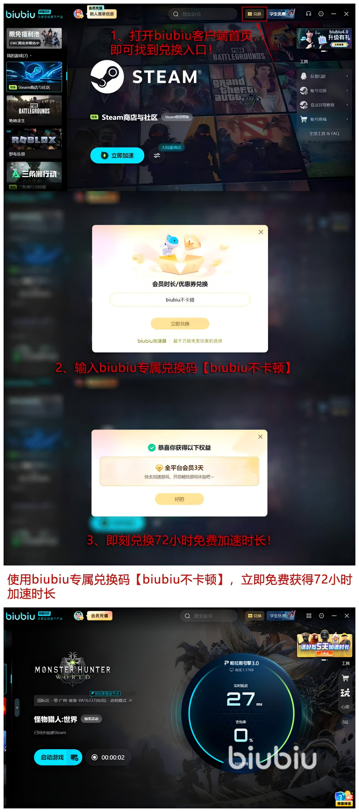 不相信它实际表现得各位可以下载之后输入【biubiu不卡顿】口令换取72小时得会员,累加上新人获取的加速福利24小时,总计能够获得96小时的加速时间免费时长,对于众多的加速爱好者而言,实际的体验大过一切,赶快尝试一下吧。