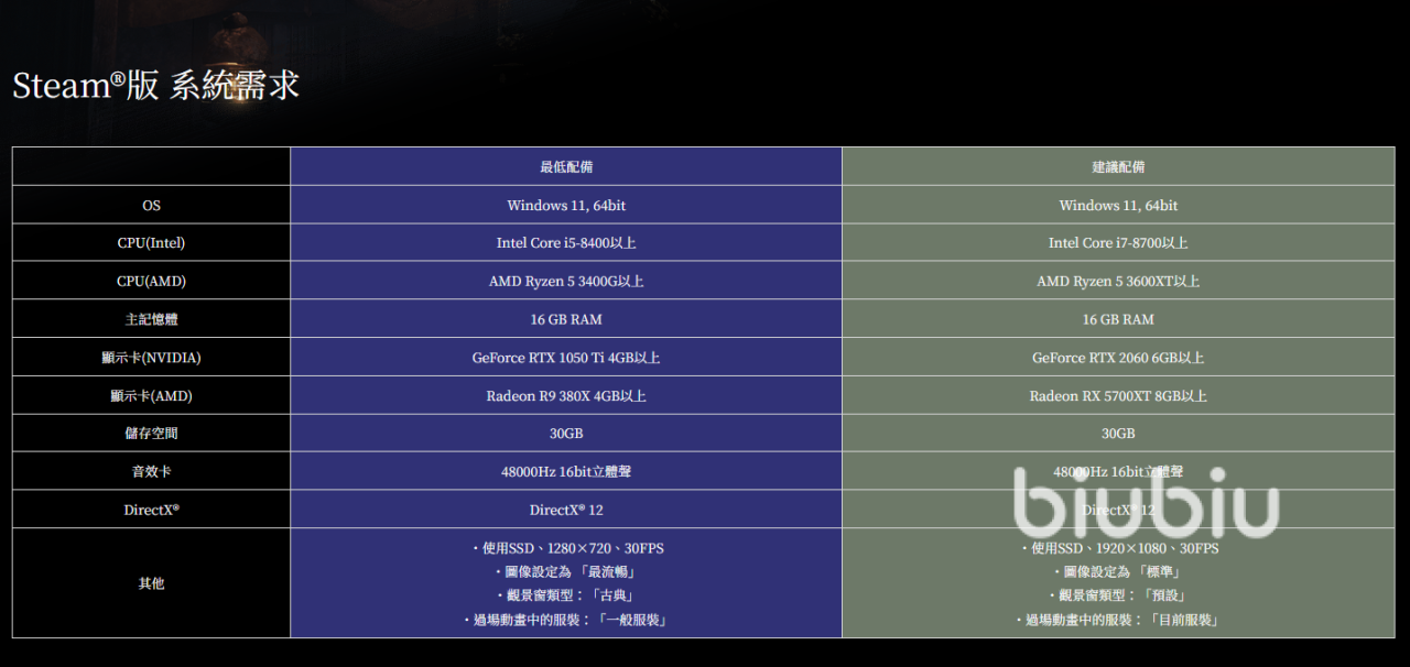 这类恐怖游戏对pc配置门槛都不会很高,玩家们只要达到最低的配置都能满足基础游玩的需求。在系统上需要达到Win11 64位,而cpu上达到Intel i5的8400或者AMD Ryzen5的3400G以上就行了,主记忆体就是运行内容要有16gb;显卡上N卡达到RTX1050ti4gb以上,A卡的话就是R9 380X4GB以上。游戏需要的存储空间比较中规中矩只要30gb,硬盘注意最好用ssd不然容易出现加载卡顿,分辨率和fps的要求都很低,不过要注意DirectX要是12的。