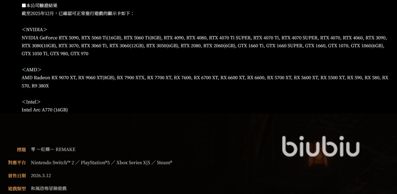 2026年03月04日 17:20 来源:酋长或比克魔王对恐怖游戏圈有所关注的玩家们肯定都知道零红蝶重制版出来的消息,那么今天小编会给大家重点解答零红蝶重制版配置要求多少这一核心的问题。这款游戏是经典的解密游戏零系列其中一个作品。而零红蝶重制版在26年的3月12号登上PC端,主机上Switch2、Xbox、PS5这些主流的游戏平台。下面小编会根据官方的资料来给大家整理详细的配置标准。