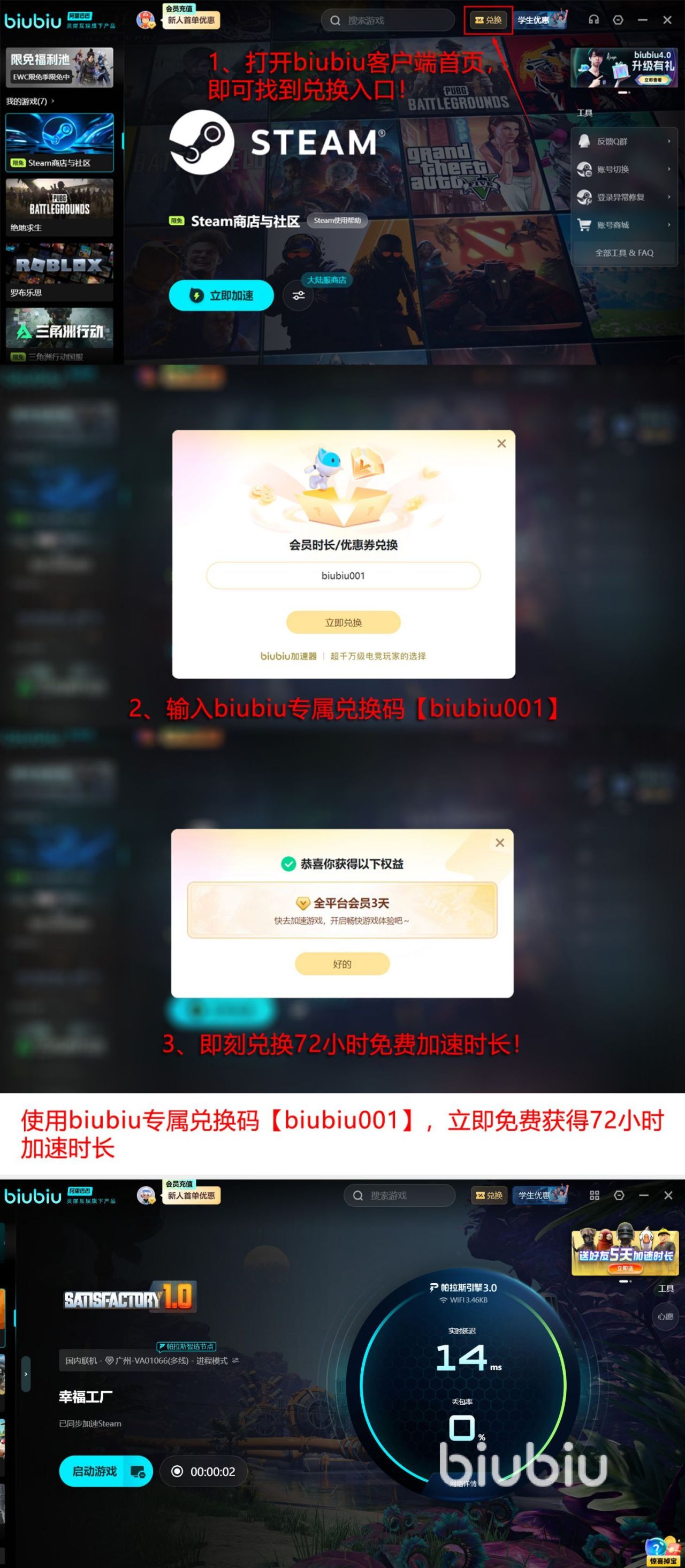 biubiu加速器如此强大,那是因为有阿里巴巴灵犀互娱的技术加持,拥有帕拉斯引擎3.0的全面升级,精准解决网络的一切问题,现在biubiu加速器还给所有的新老用户准备了大量的福利,首先给广大的新用户们准备24小时免费体验的时间,注册就可获得,biubiu001这个口令码还能够让新老用户兑换到3天的使用时间,总计96小时。