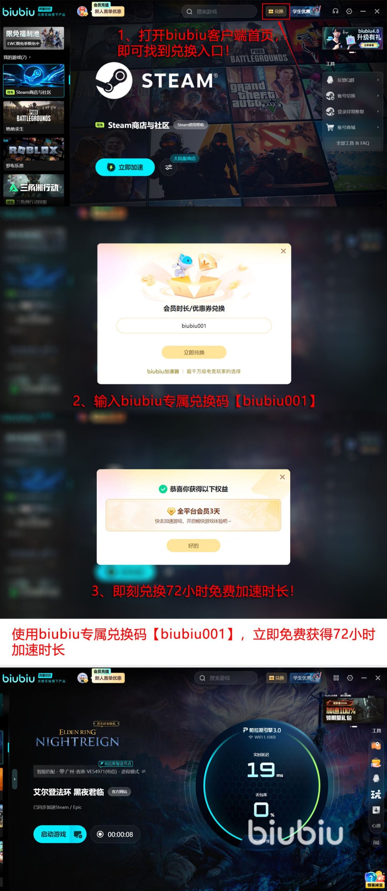 现如今biubiu加速器已经推出了多重免费的福利,比如新老用户直接使用兑换码biubiu001,可以解锁三天免费加速时间。新用户可以注册,额外获得24小时的免费加速时间,这样新用户可以解锁96小时免费加速的时间,就可以让玩家畅快的体验艾尔登法环黑夜君临。