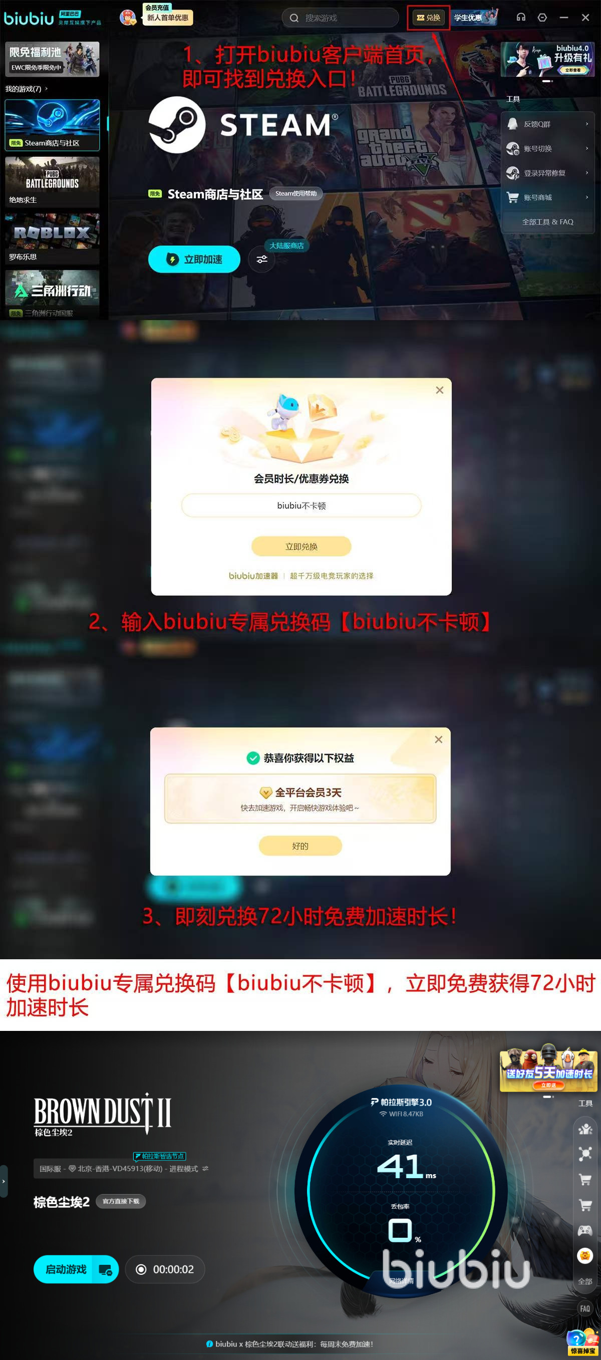 新用户注册biubiu加速器之后,就会自动获得首日24小时全功能免费试用权限,输入【biubiu不卡顿】还可以获得72小时免费加速时长。这就意味着新用户总共享有96小时的免费体验期。