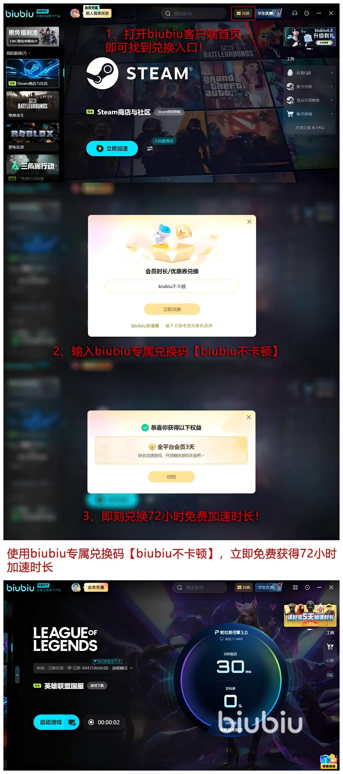 还能使用【biubiu不卡顿】口令获取72小时免费口令,累计新人获取的加速福利24小时时间,总计能够获得96小时的加速时间,这些时间对于各位来讲都是非常好用,保准能让大家感受特殊加速带来的不同,对于还在联机的各位有着巨大的帮助。