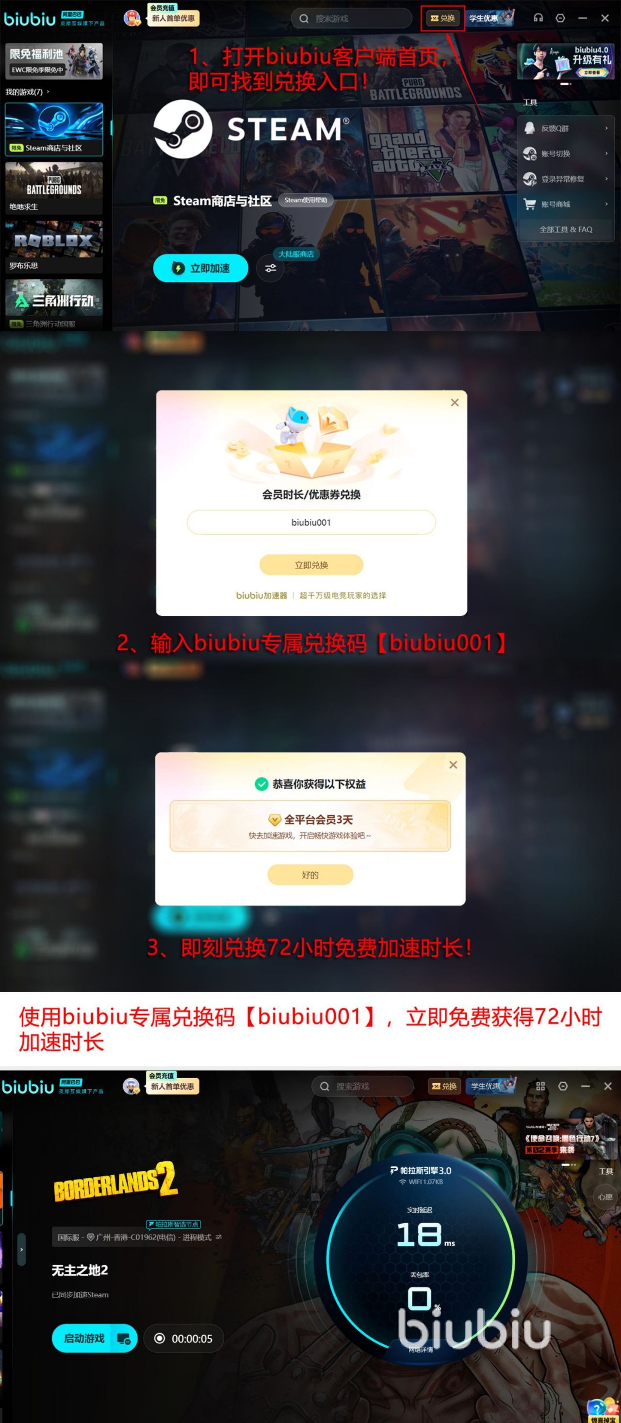 备受好评的加速工具这就是给大家介绍的biubiu,是阿里巴巴灵犀互娱所打造,所以所拥有的实力特别的强大,其中自研的帕拉斯3.0引擎也是进行了全面升级的,可以给很多电竞类型的游戏提供专业的电竞网络加持,就连很多专业级别的电竞队训练都指定了这一款工具。如果大家从来还没有体验过的话,可以通过如今的新用户注册的方式解锁24小时的免费加速时长,即使是早就已经注册的用户,也不需要担心,因为还有一种新老用户都可以使用的方法,就是输入【biubiu001】也能够免费加速三天,这种情况下一共可以让大家享受最多96个小时的加速时长。