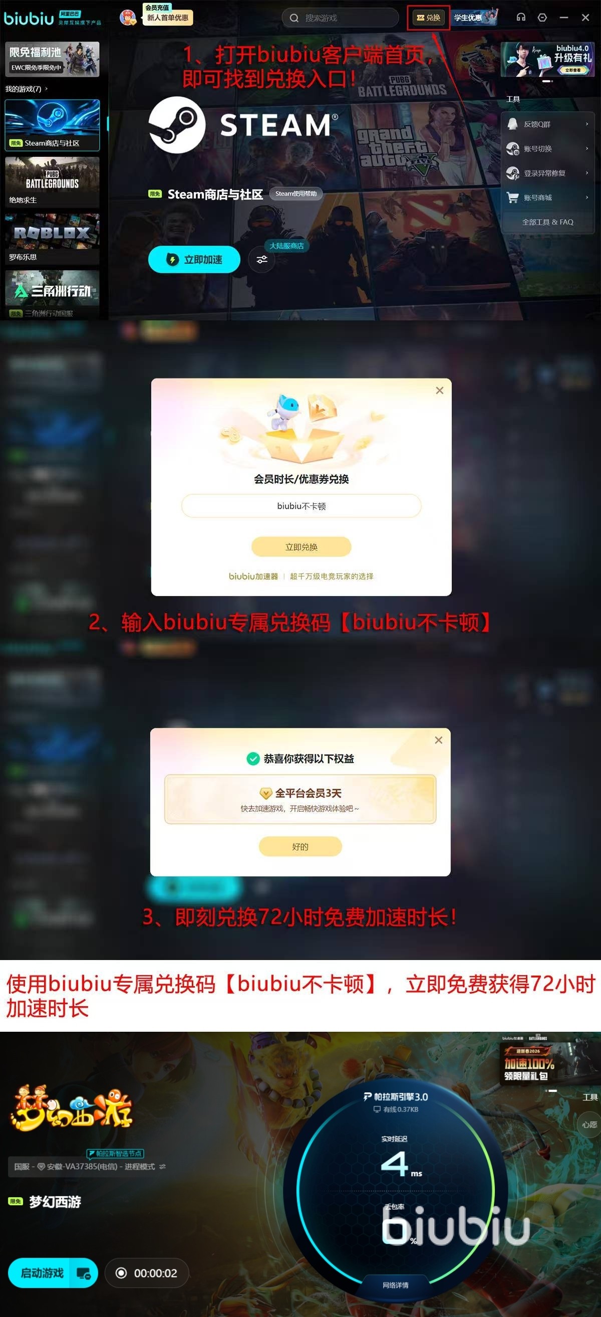 就比如福利活动,这加速器拥有【biubiu不卡顿】兑换码兑换三天使用时长的福利活动,还拥有新用户注册免费使用24小时的福利,这两项福利活动所给到的时间累计就是96小时,这个时长是非常夸张的可以说福利方面也是非常丰厚的,这还只是优点之一,此外还拥有海量的游戏库存,在加速器的库中可以看到市面上几乎所有的热门游戏,并且为这些游戏提供了多区服和节点的加速选项,就意味着在后续玩家还有其他的游戏加速需求也可以使用这加速器,因此因为有这么多优点的存在才推荐大家去使用该加速器。