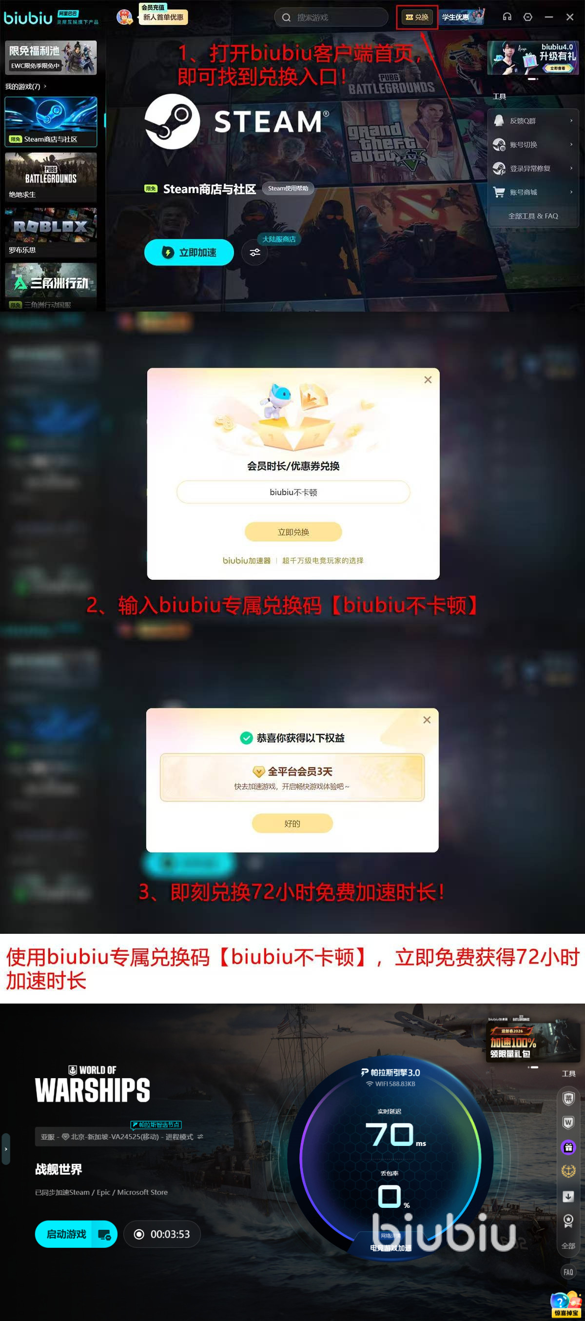 初次使用新用户享受的入门礼包是biubiu提供的诚意之作,注册即刻激活24小时全功能尊享试用,输入【biubiu不卡顿】可额外获得72小时免费加速特权。双倍福利叠加,新人可以享受到总计96个小时的无门槛高速体验。