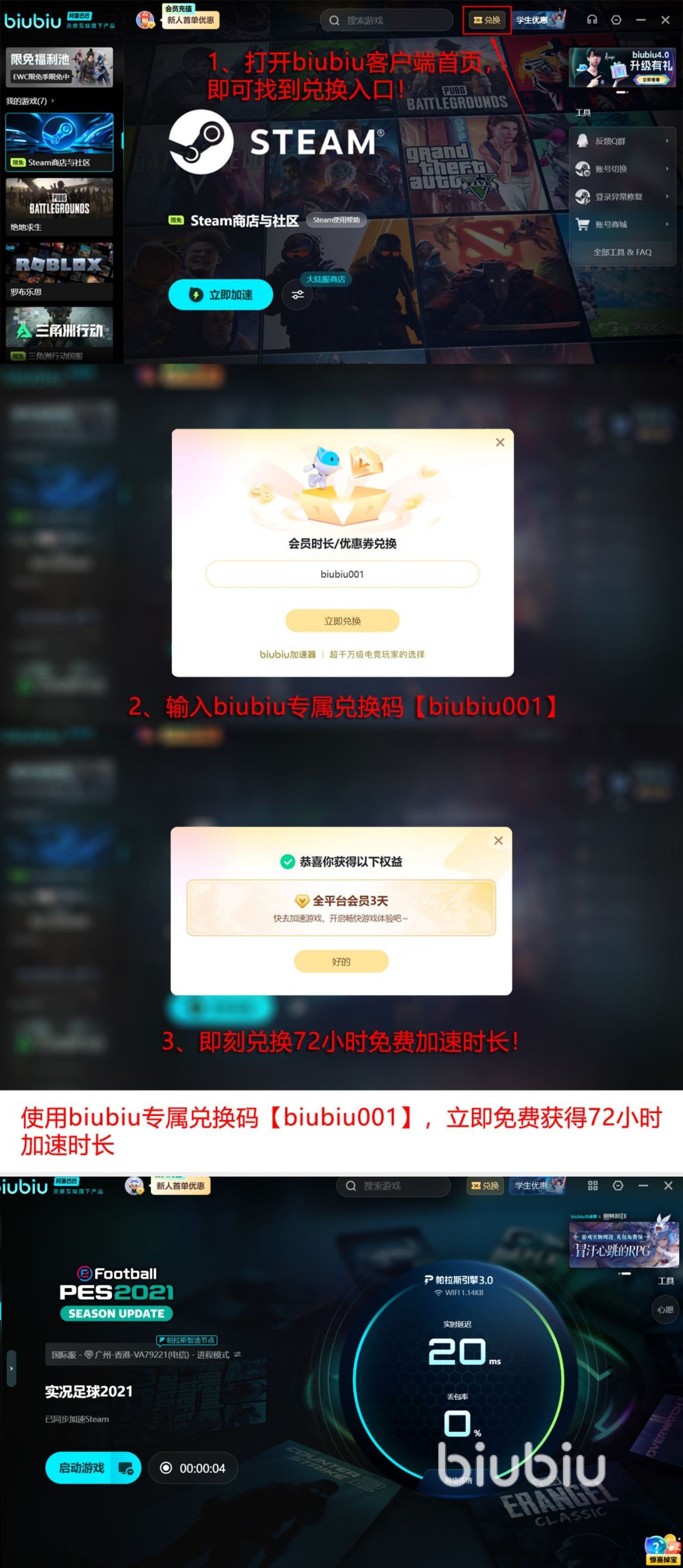 作为一款PUBG冠军选手小叮当所认定的加速器,那还是值得大家认可的。还有阿里巴巴灵犀互娱大厂技术,在行业内会拥有比较出色的影响力。操作上只需要打开加速器,然后搜索游戏的名称就可以迅速的加速,解决丢包等一系列问题。那不得不说的,自然就是专属的免费福利。现在对新用户而言,最高免费时长可以累积96小时,新用户在第1次注册之后,免费24小时。【biubiu001】是一个通用的口令,可以免费3天的加速时长。所以大家不要错过这一个薅羊毛的大好机会。