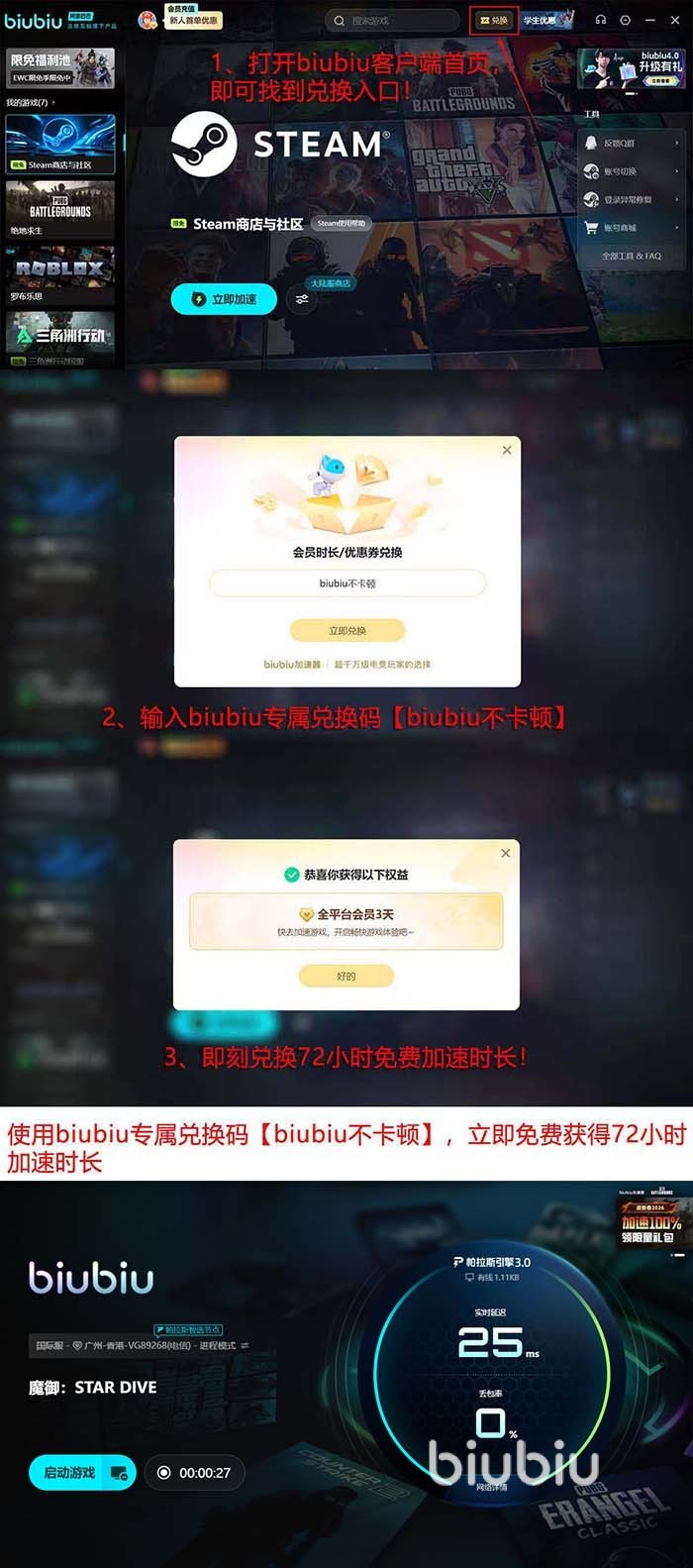 对于和电竞游戏差不多的动作游戏STAR DIVE来说,其对网络质量需求并不低,正在为网络问题烦恼的小伙伴,不妨先领取几天免费时间,体验一下。可通过两个方式领取到,一个是注册时系统送的24小时,另外一个是用口令【biubiu不卡顿】在首页兑换得到的72小时,一个账号总计能有96小时免费时间可领取。