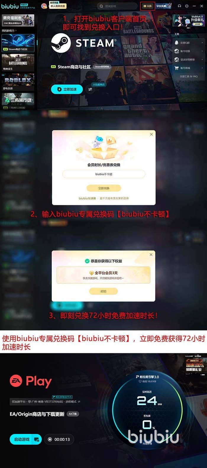 经过加速后的网络,能给大家更平稳的游戏下载速度,更稳定的游戏环境,享受到游戏的极致体验乐趣。如果现在正为下Origin平台的游戏,或在玩EA游戏,大家可以领取免费时间尝试一下,有两个时间可以免费领取,一个是注册新账号时,系统自动送到账号上的24小时,接着用封面“兑换”功能,用口令兑换码【biubiu不卡顿】,可再获取到72小时,一个账号总计是能有96小时的。