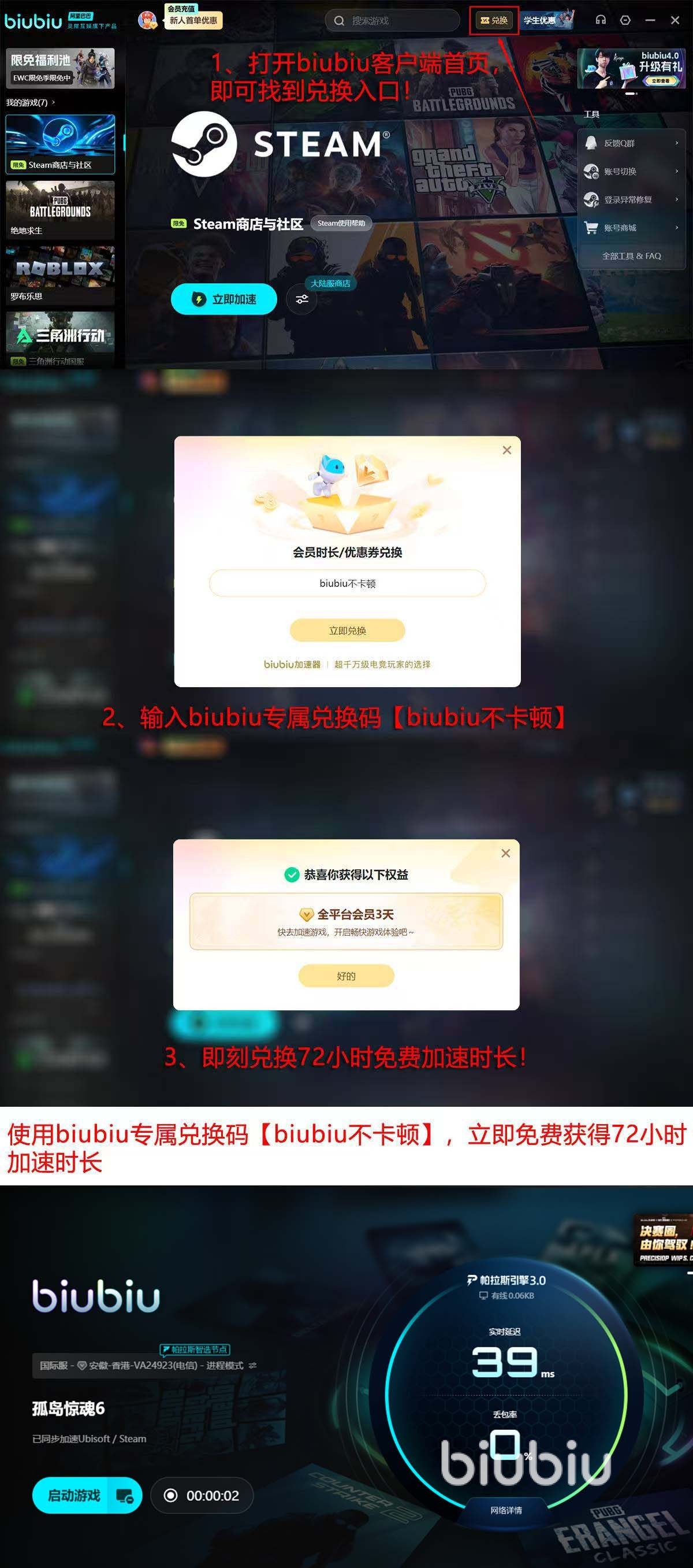 如果大家正在玩孤岛惊魂6,或者其他国际服游戏,正在为游戏网络折磨,不妨先领取几天免费时间,测试一下效果,一般先领取到注册时系统送的24小时,自送打到账户上,不需要手动领取,接着到首页“兑换”处,属于口令【biubiu不卡顿】后,就能再得到72小时,两个福利累积有96小时。