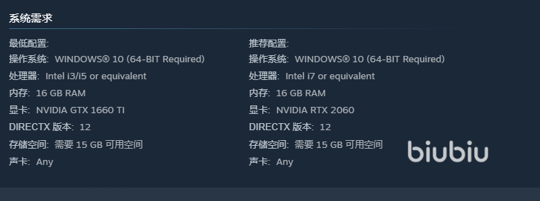 官方给的最低要求是拥有i3/i5的处理器,显卡最好是gtx1660ti以上,然后运行内存条要有16gb,存储空间不算大,只要15gb。不过这样只能开启低画质,想要中高等级画面,处理器要是i7的,然后显卡提升到rtx2060级别,当然越高越好,可以开最高等画质。