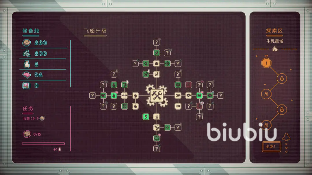 资源采集采用自动吸附机制——击毁目标后掉落的咖啡豆,只要处于飞船有效收集范围内,即可实时归入库存;界面下方设有可视化进度条,积累满额后触发区域推进,击败关卡Boss即可解锁下一探索区域。全游戏共设20余个可探索星球场景,每个区域具备独特视觉风格与环境交互逻辑。