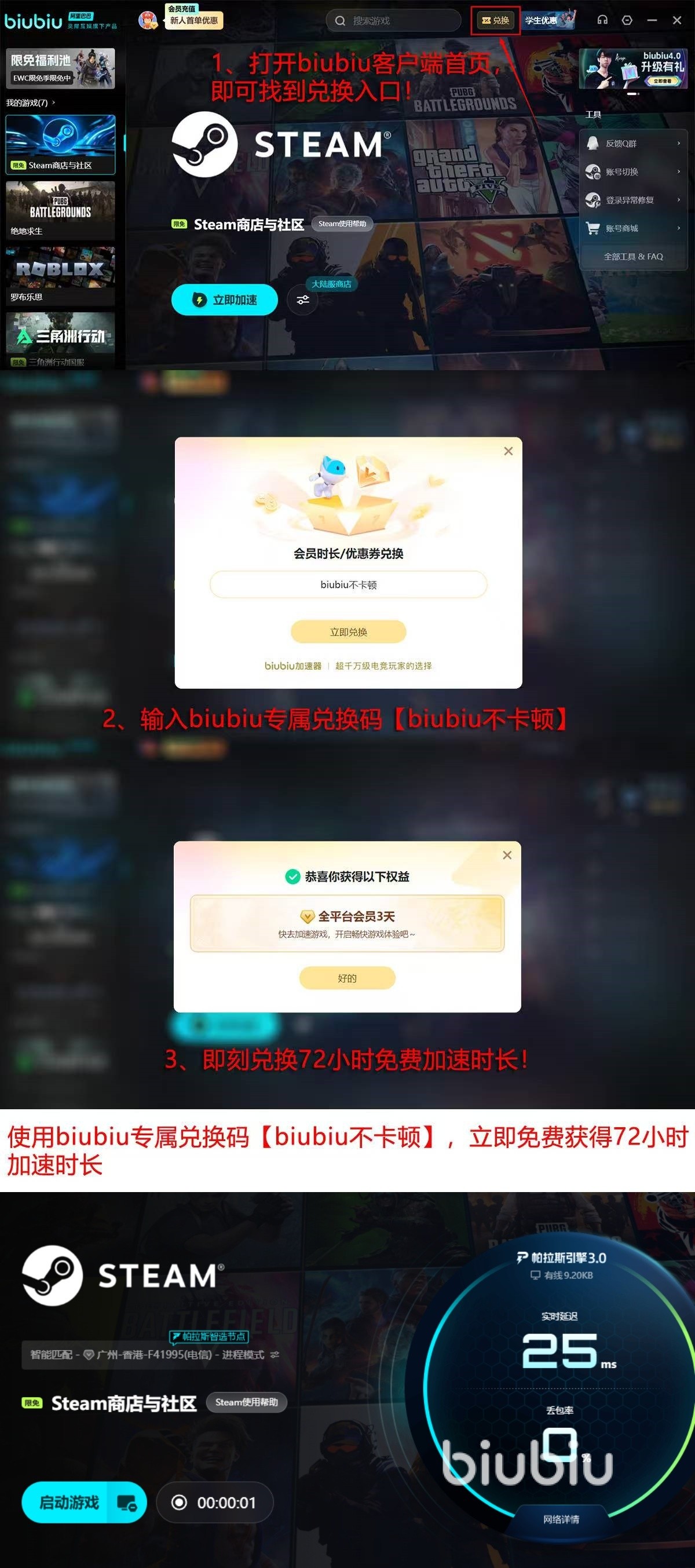 面向新用户,biubiu加速器同步推出限时福利:首次启动即赠送24小时全游戏通用加速时长;输入专属兑换码【biubiu不卡顿】,还可额外领取72小时加速权益,总计可达96小时免费体验。