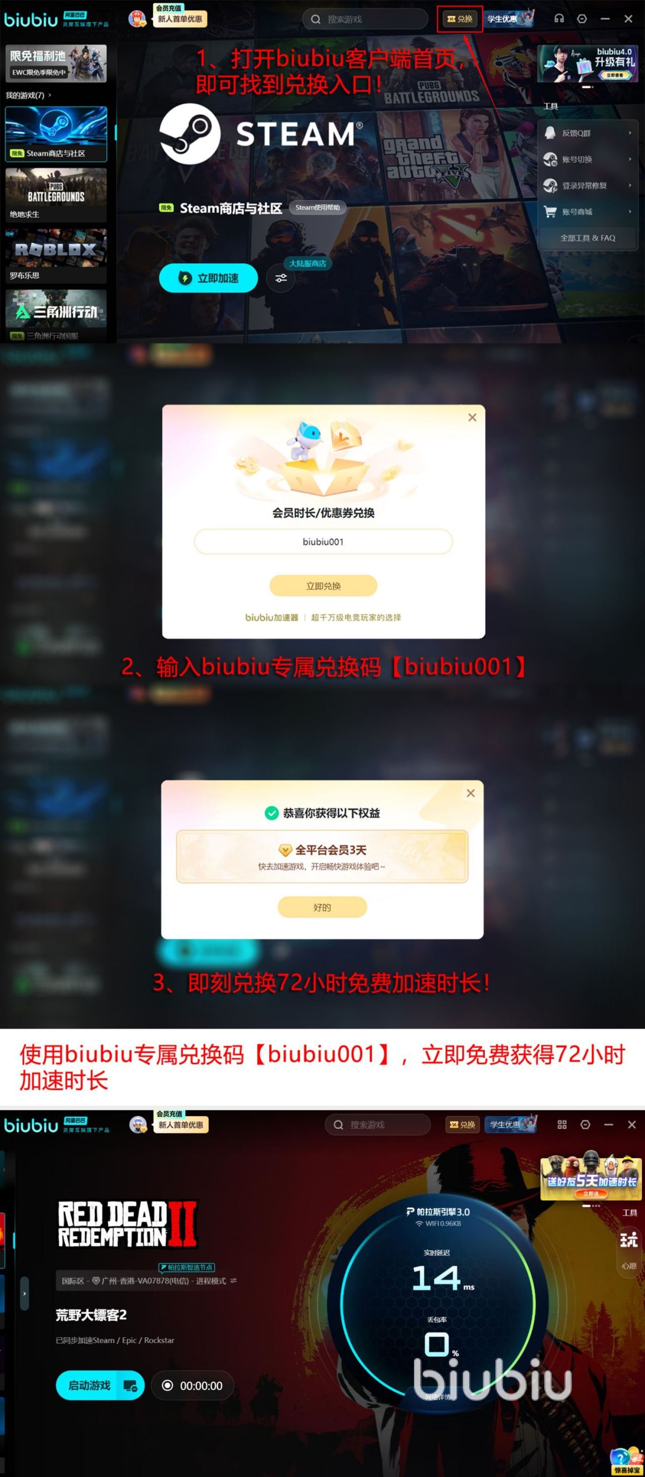 目前推送的福利也非常良心,所有用户都有机会免费试用,只要使用兑换码【biubiu001】就能成功解锁三天全平台免费加速时长,所有新用户可额外领取24小时免费加速福利,也叠加至96小时,全平台无限制,无论各类游戏都能够轻松下载并自由加速,享受极速体验。